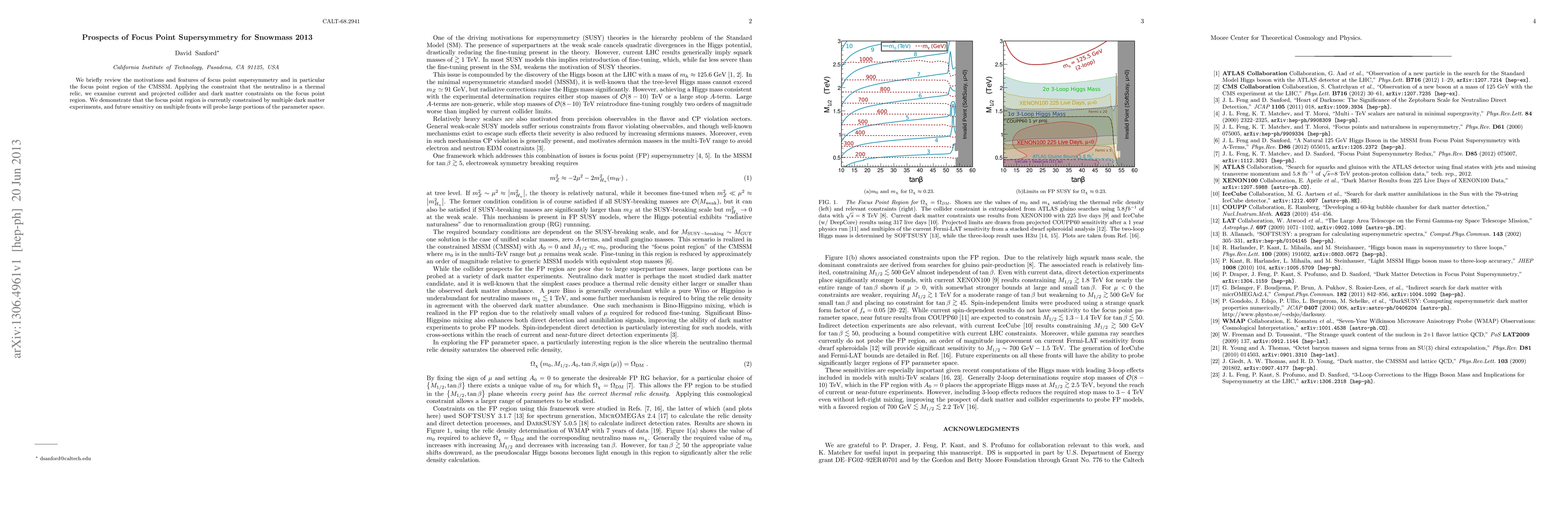 We briefly review the motivations and features of focus point supersymmetry and in particular the focus point region of the CMSSM. Applying the constraint that the neutralino is a thermal relic, we examine current and projected collider and dark matter constraints on the focus point region. We demonstrate that the focus point region is currently constrained by multiple dark matter experiments, and future sensitivy on multiple fronts will probe large portions of the parameter space.