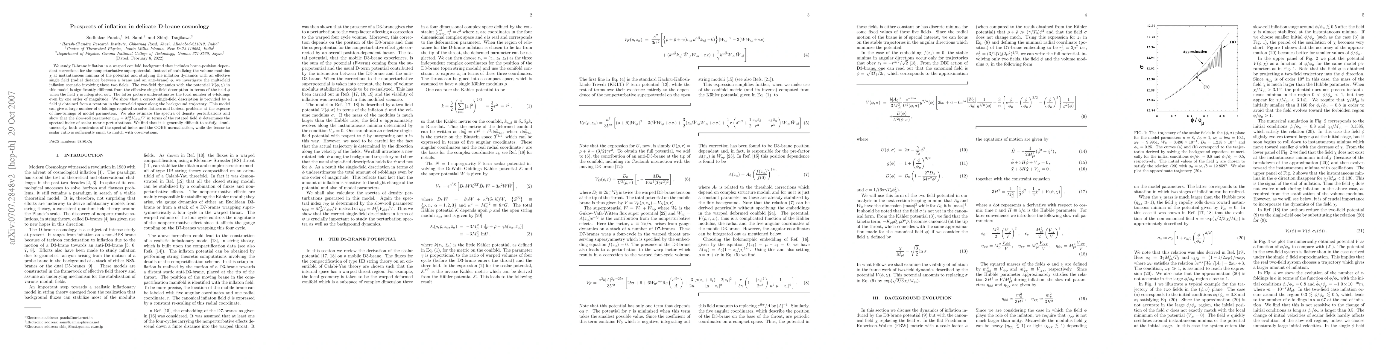 We study D-brane inflation in a warped conifold background that includes brane-position dependent corrections for the nonperturbative superpotential. Instead of stabilizing the volume modulus chi at instantaneous minima of the potential and studying the inflation dynamics with an effective single field (radial distance between a brane and an anti-brane) phi, we investigate the multi-field inflation scenario involving these two fields. The two-field dynamics with the potential V(phi,chi) in this model is significantly different from the effective single-field description in terms of the field phi when the field chi is integrated out. The latter picture underestimates the total number of e-foldings even by one order of magnitude. We show that a correct single-field description is provided by a field psi obtained from a rotation in the two-field space along the background trajectory. This model can give a large number of e-foldings required to solve flatness and horizon problems at the expense of fine-tunings of model parameters. We also estimate the spectra of density perturbations and show that the slow-roll parameter eta_{psi psi}=M_{pl}^2 V_{,psi psi}/V in terms of the rotated field psi determines the spectral index of scalar metric perturbations. We find that it is generally difficult to satisfy, simultaneously, both constraints of the spectral index and the COBE normalization, while the tensor to scalar ratio is sufficiently small to match with observations.
