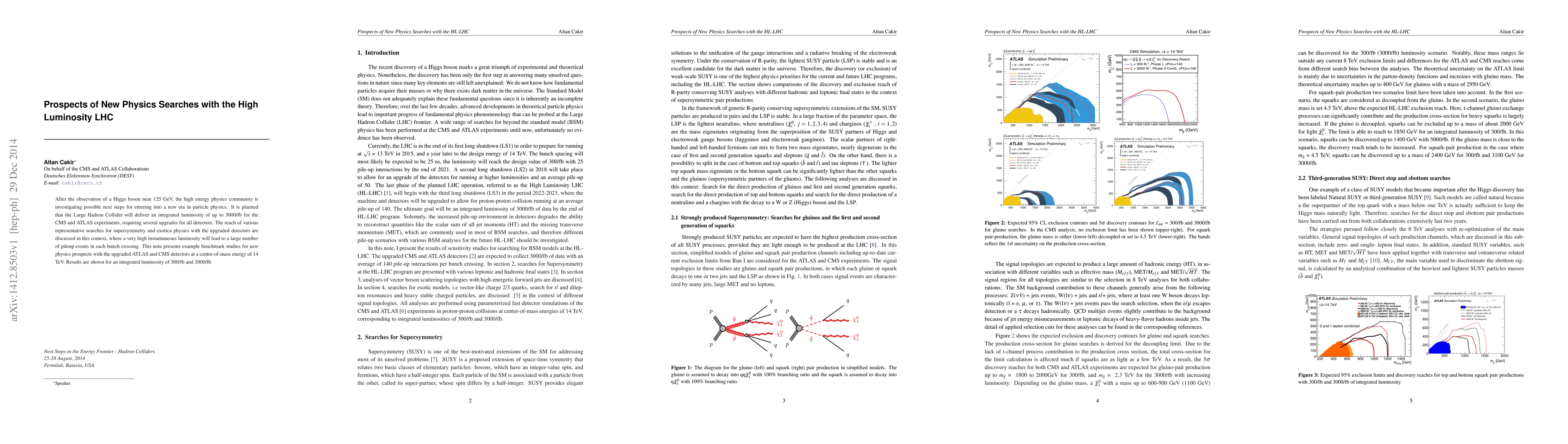 After the observation of a Higgs boson near 125 GeV, the high energy physics community is investigating possible next steps for entering into a new era in particle physics. It is planned that the Large Hadron Collider will deliver an integrated luminosity of up to 3000/fb for the CMS and ATLAS experiments, requiring several upgrades for all detectors. The reach of various representative searches for supersymmetry and exotica physics with the upgraded detectors are discussed in this context, where a very high instantaneous luminosity will lead to a large number of pileup events in each bunch crossing. This note presents example benchmark studies for new physics prospects with the upgraded ATLAS and CMS detectors at a centre-of-mass energy of 14 TeV. Results are shown for an integrated luminosity of 300/fb and 3000/fb.