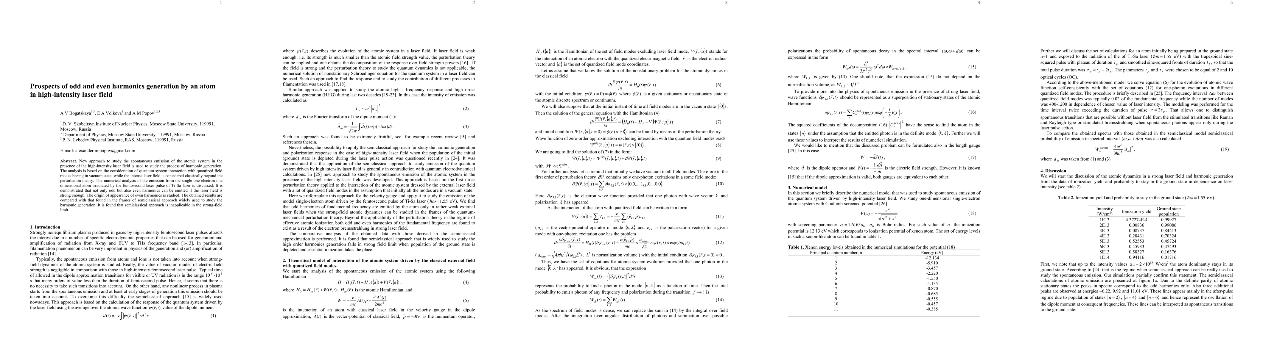 New approach to study the spontaneous emission of the atomic system in the presence of the high-intensity laser field is used to study the process of harmonic generation. The analysis is based on the consideration of quantum system interaction with quantized field modes beeing in vacuum state, while the intense laser field is considered classically beyond the perturbation theory. The numerical analysis of the emission from the single one-electron one dimensional atom irradiated by the femtosecond laser pulse of Ti-Sa laser is discussed. It is demonstrated that not only odd but also even harmonics can be emitted if the laser field is strong enough. The origin of appearance of even harmonics is studied. The obtained results are compared with that found in the frames of semiclassical approach widely used to study the harmonic generation. It is found that semiclassical approach is inapplicable in the strong-field limit.
