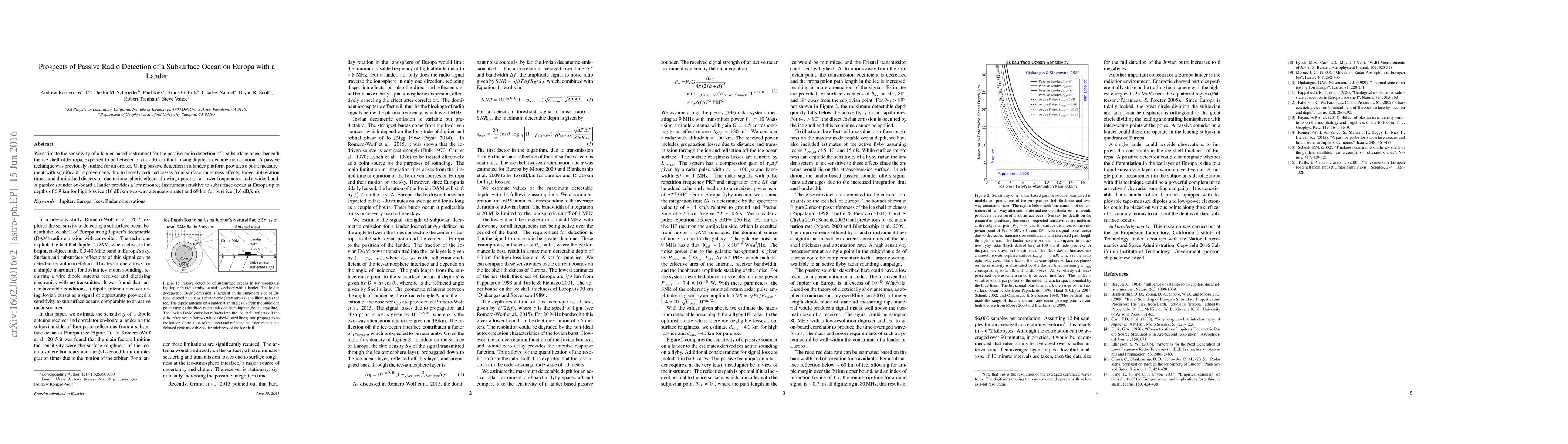 We estimate the sensitivity of a lander-based instrument for the passive radio detection of a subsurface ocean beneath the ice shell of Europa, expected to be between 3~km - 30~km thick, using Jupiter's decametric radiation. A passive technique was previously studied for an orbiter. Using passive detection in a lander platform provides a point measurement with significant improvements due to largely reduced losses from surface roughness effects, longer integration times, and diminished dispersion due to ionospheric effects allowing operation at lower frequencies and a wider band. A passive sounder on-board a lander provides a low resource instrument sensitive to subsurface ocean at Europa up to depths of 6.9~km for high loss ice (16 dB/km two-way attenuation rate) and 69~km for pure ice (1.6 dB/km).