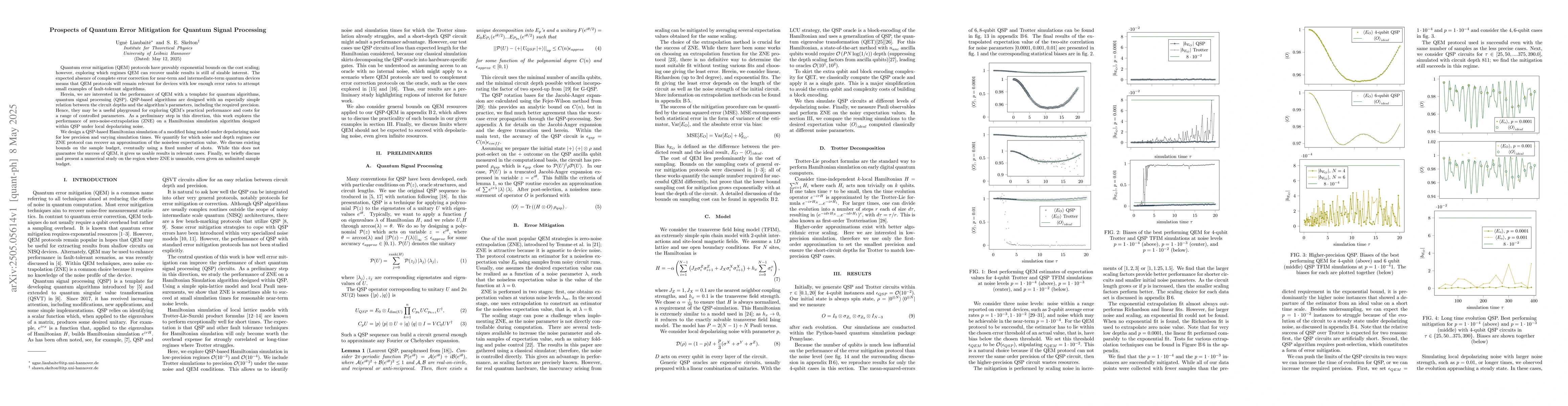 The paper presents a preliminary analysis of ZNE performance for QSP-based Hamiltonian simulation under depolarizing noise, providing insights into the practicality of QEM for near-term quantum devices.