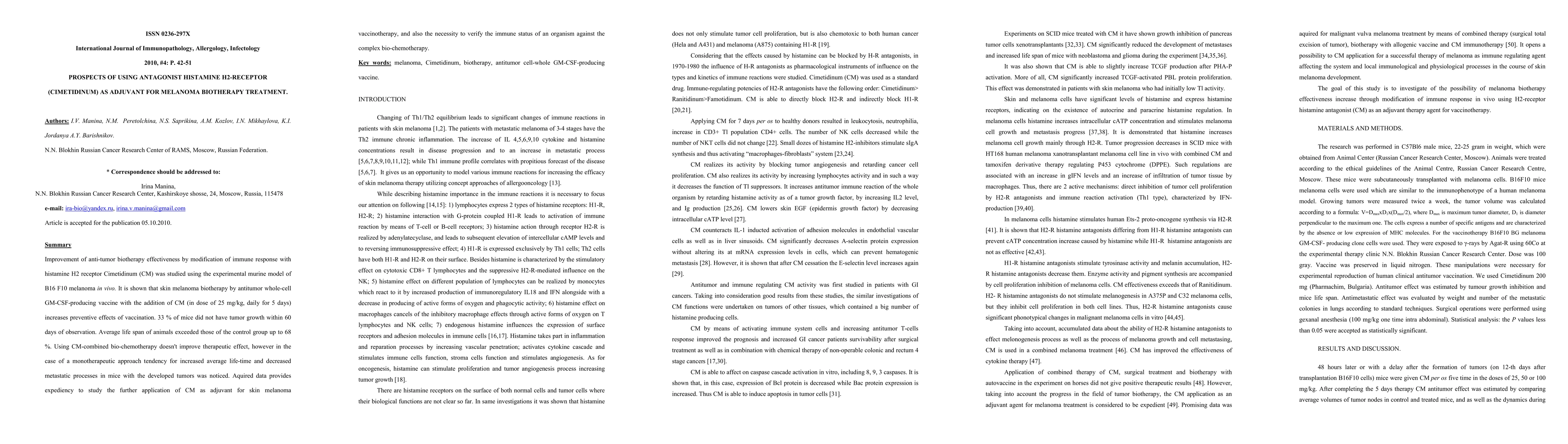 This study investigates the potential of histamine H2-receptor antagonist Cimetidinum (CM) as an adjuvant in melanoma biotherapy, showing that CM enhances the preventive effects of GM-CSF-producing vaccine in melanoma-bearing mice, significantly increasing survival rates and reducing tumor growth. Further research is warranted to explore CM's role in skin melanoma vaccinotherapy.