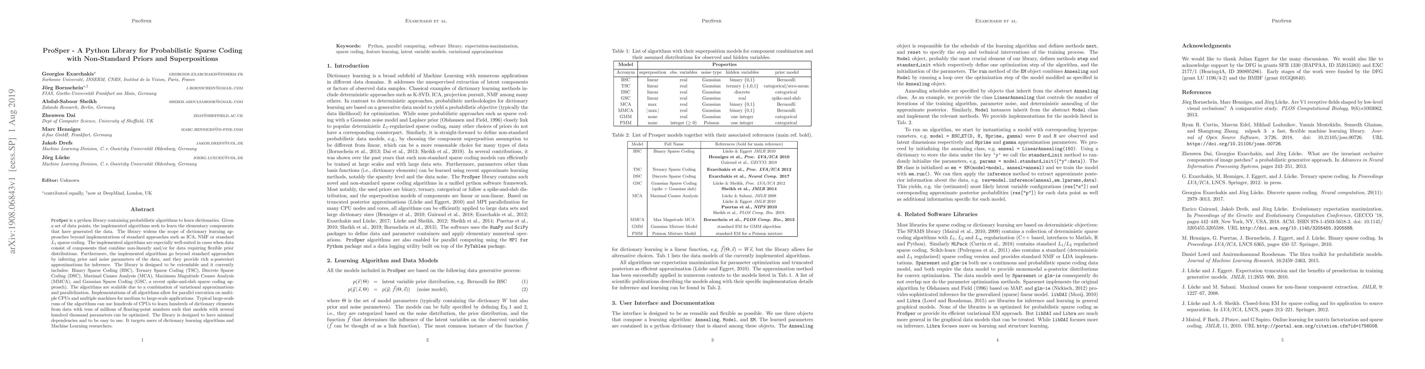 ProSper is a Python library for probabilistic sparse coding with non-standard priors and superpositions, offering scalable algorithms for learning dictionaries from complex data. It extends beyond standard approaches and includes various sparse coding methods, supporting parallel execution for large-scale applications.