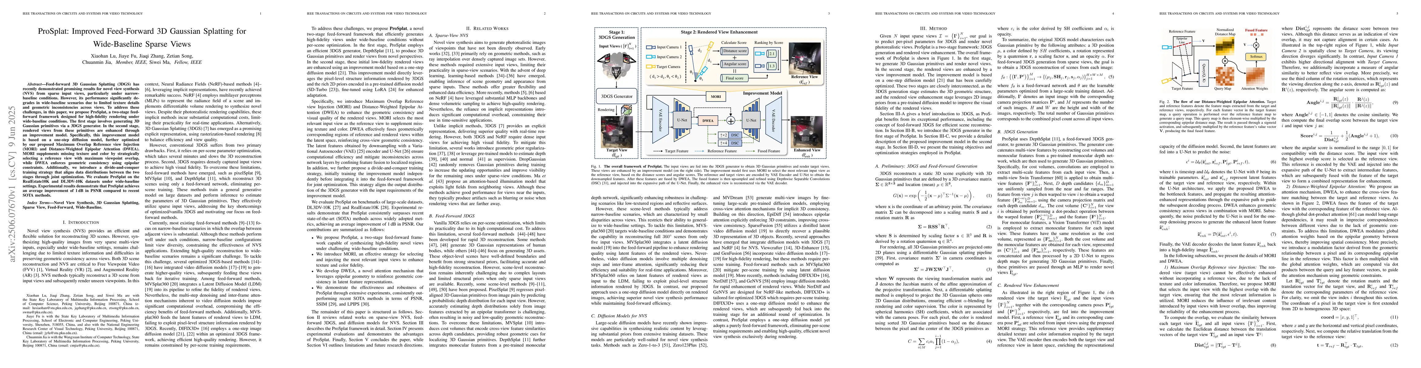 Feed-forward 3D Gaussian Splatting (3DGS) has recently demonstrated promising results for novel view synthesis (NVS) from sparse input views, particularly under narrow-baseline conditions. However, its performance significantly degrades in wide-baseline scenarios due to limited texture details and geometric inconsistencies across views. To address these challenges, in this paper, we propose ProSplat, a two-stage feed-forward framework designed for high-fidelity rendering under wide-baseline conditions. The first stage involves generating 3D Gaussian primitives via a 3DGS generator. In the second stage, rendered views from these primitives are enhanced through an improvement model. Specifically, this improvement model is based on a one-step diffusion model, further optimized by our proposed Maximum Overlap Reference view Injection (MORI) and Distance-Weighted Epipolar Attention (DWEA). MORI supplements missing texture and color by strategically selecting a reference view with maximum viewpoint overlap, while DWEA enforces geometric consistency using epipolar constraints. Additionally, we introduce a divide-and-conquer training strategy that aligns data distributions between the two stages through joint optimization. We evaluate ProSplat on the RealEstate10K and DL3DV-10K datasets under wide-baseline settings. Experimental results demonstrate that ProSplat achieves an average improvement of 1 dB in PSNR compared to recent SOTA methods.