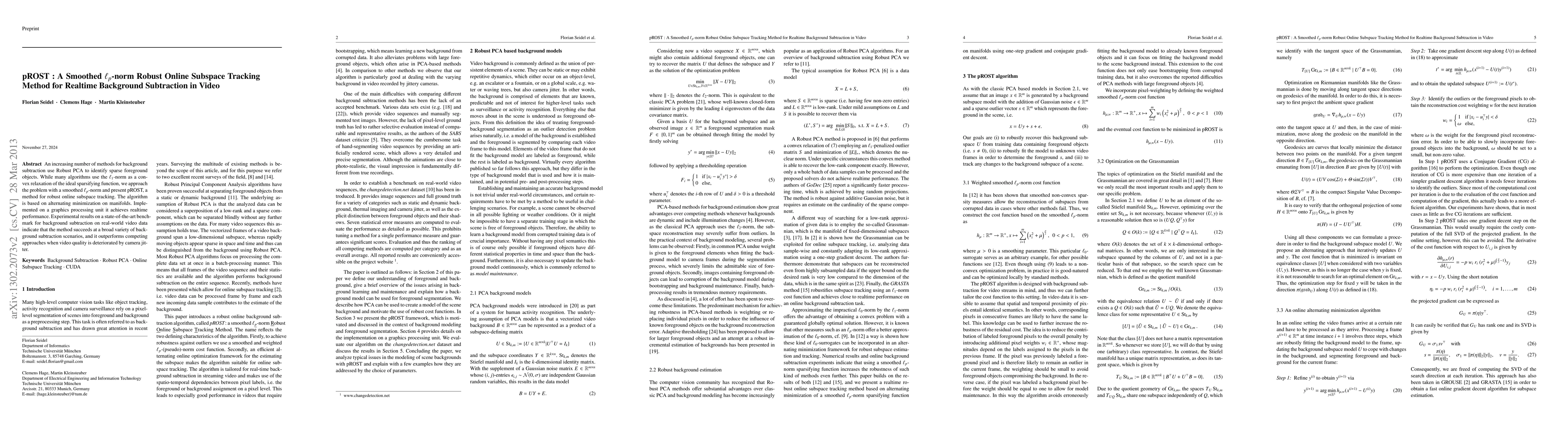 pROST introduces a smoothed Lp-norm robust online subspace tracking method for realtime background subtraction in video, achieving realtime performance on a GPU. Experimental results show superior performance in various scenarios, especially under camera jitter, outperforming other methods.