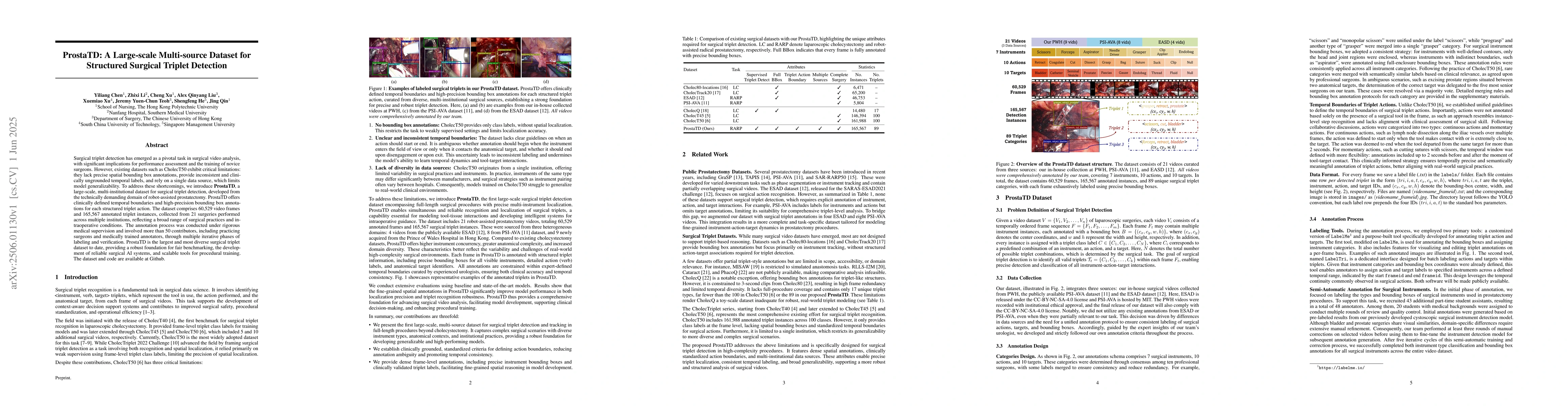 ProstaTD stands out as the largest and most diverse surgical triplet dataset to date, offering a significant improvement over existing datasets with inconsistent and clinically ungrounded temporal labels and single-source limitations.