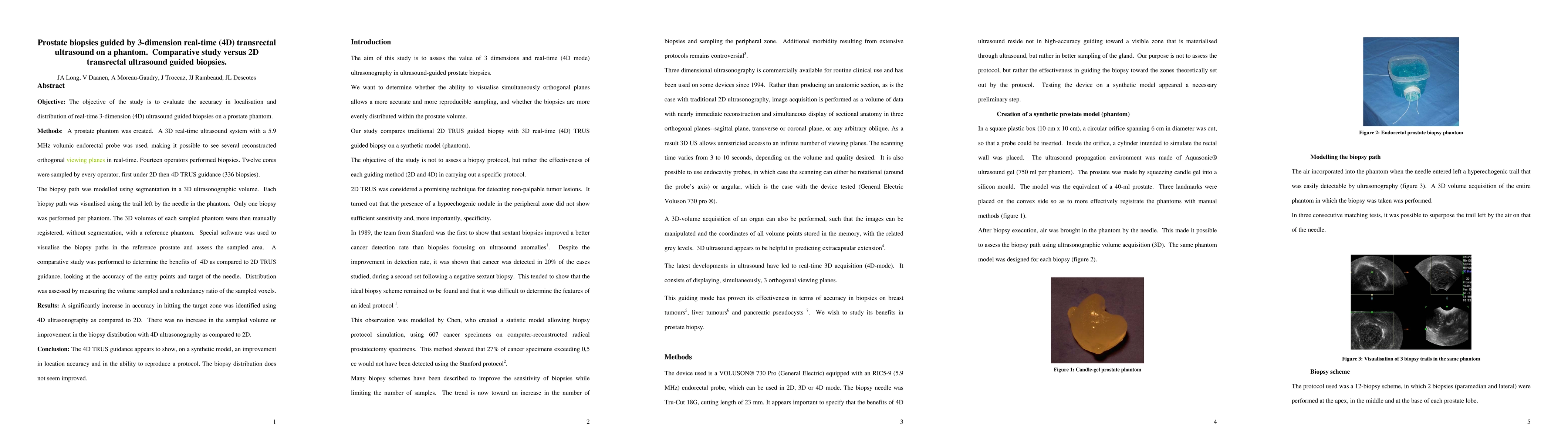 OBJECTIVE: This study evaluated the accuracy in localisation and distribution of real-time three-dimensional (4-D) ultrasound-guided biopsies on a prostate phantom. METHODS: A prostate phantom was created. A three-dimensional real-time ultrasound system with a 5.9MHz probe was used, making it possible to see several reconstructed orthogonal viewing planes in real time. Fourteen operators performed biopsies first under 2-D then 4-D transurethral ultrasound (TRUS) guidance (336 biopsies). The biopsy path was modelled using segmentation in a 3-D ultrasonographic volume. Special software was used to visualise the biopsy paths in a reference prostate and assess the sampled area. A comparative study was performed to examine the accuracy of the entry points and target of the needle. Distribution was assessed by measuring the volume sampled and a redundancy ratio of the sampled prostate. RESULTS: A significant increase in accuracy in hitting the target zone was identified using 4-D ultrasonography as compared to 2-D. There was no increase in the sampled volume or improvement in the biopsy distribution with 4-D ultrasonography as compared to 2-D. CONCLUSION: The 4-D TRUS guidance appears to show, on a synthetic model, an improvement in location accuracy and in the ability to reproduce a protocol. The biopsy distribution does not seem improved.