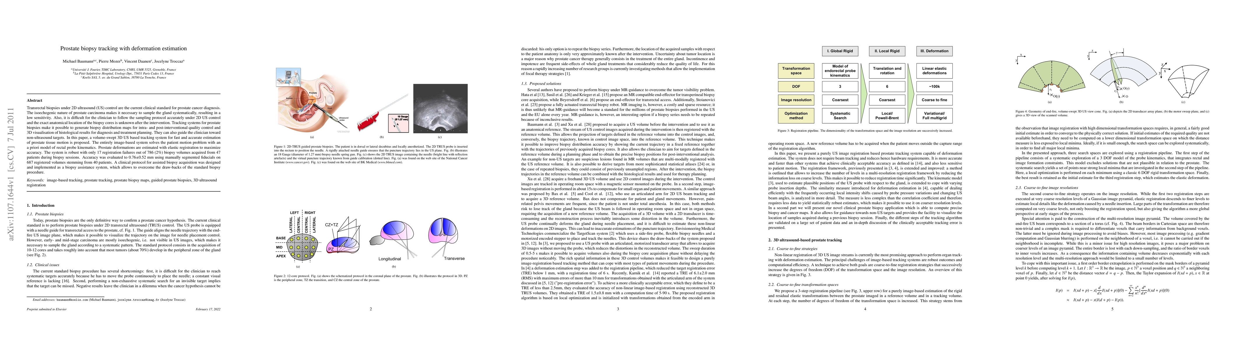 This paper proposes a 3D ultrasound-based tracking system for prostate biopsies, estimating tissue motion accurately and robustly with only 2% failure rate. It introduces a clinical protocol for assisted biopsy acquisition, aiming to enhance standard biopsy procedures' limitations.