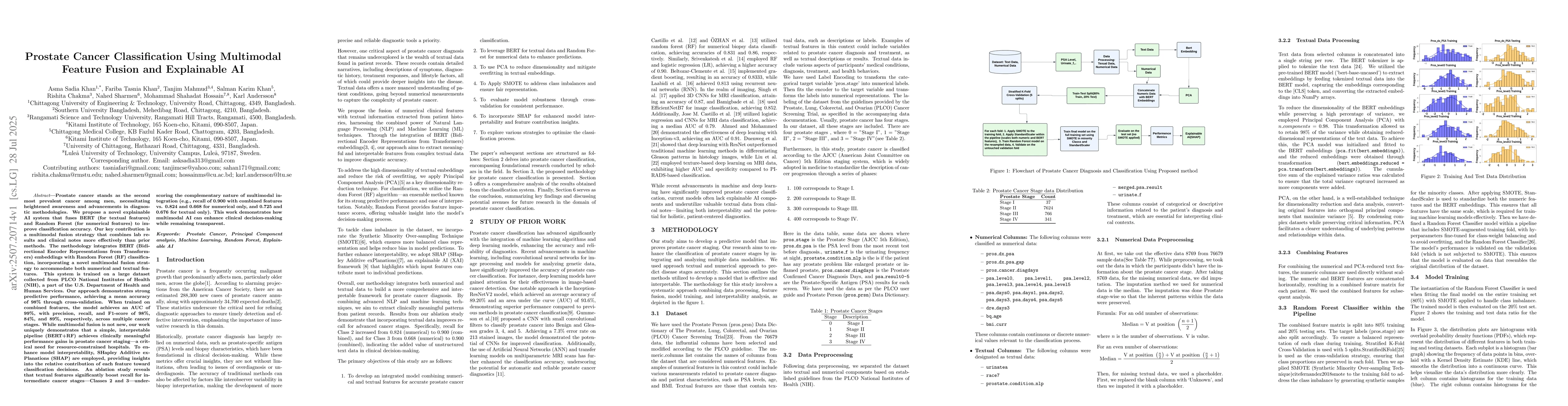 Prostate cancer, the second most prevalent male malignancy, requires advanced diagnostic tools. We propose an explainable AI system combining BERT (for textual clinical notes) and Random Forest (for numerical lab data) through a novel multimodal fusion strategy, achieving superior classification performance on PLCO-NIH dataset (98% accuracy, 99% AUC). While multimodal fusion is established, our work demonstrates that a simple yet interpretable BERT+RF pipeline delivers clinically significant improvements - particularly for intermediate cancer stages (Class 2/3 recall: 0.900 combined vs 0.824 numerical/0.725 textual). SHAP analysis provides transparent feature importance rankings, while ablation studies prove textual features' complementary value. This accessible approach offers hospitals a balance of high performance (F1=89%), computational efficiency, and clinical interpretability - addressing critical needs in prostate cancer diagnostics.