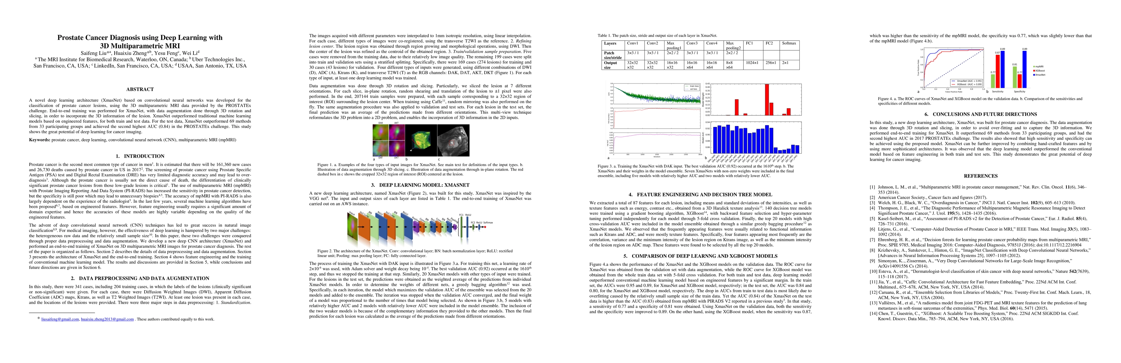 This paper introduces XmasNet, a deep learning model based on convolutional neural networks, for classifying prostate cancer lesions using 3D multiparametric MRI data. XmasNet outperformed traditional machine learning models and achieved the second highest AUC in the PROSTATEx challenge, demonstrating deep learning's potential in cancer imaging.