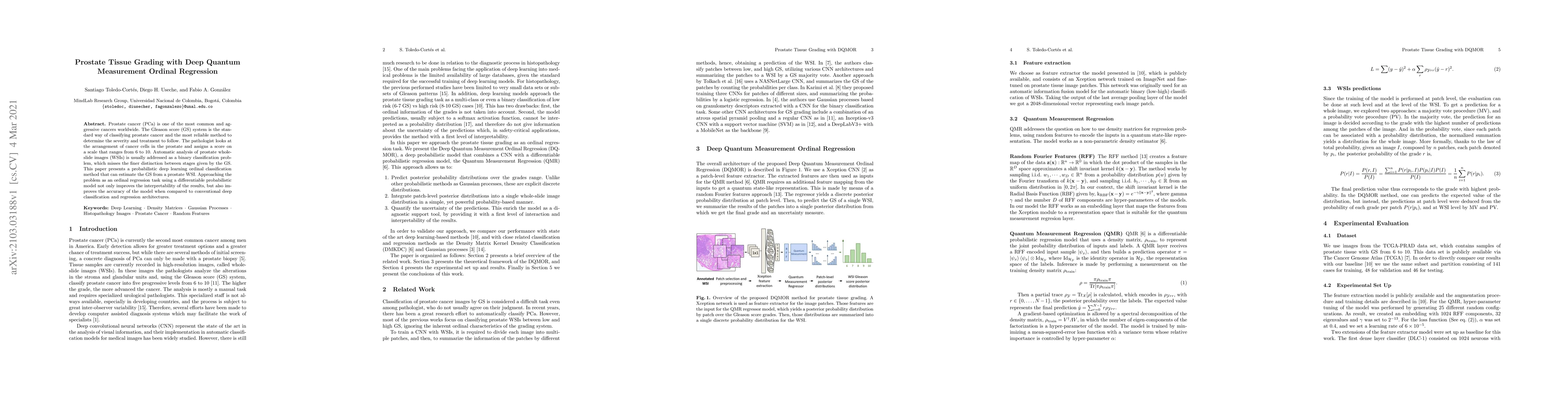 The research presents a probabilistic deep learning ordinal classification method for estimating the Gleason score (GS) from a prostate whole-slide image (WSI) using a differentiable probabilistic model, Quantum Measurement Regression (QMR). The method combines the representational power of deep learning with QMR, which uses density matrices and random features to build a non-parametric density estimator.