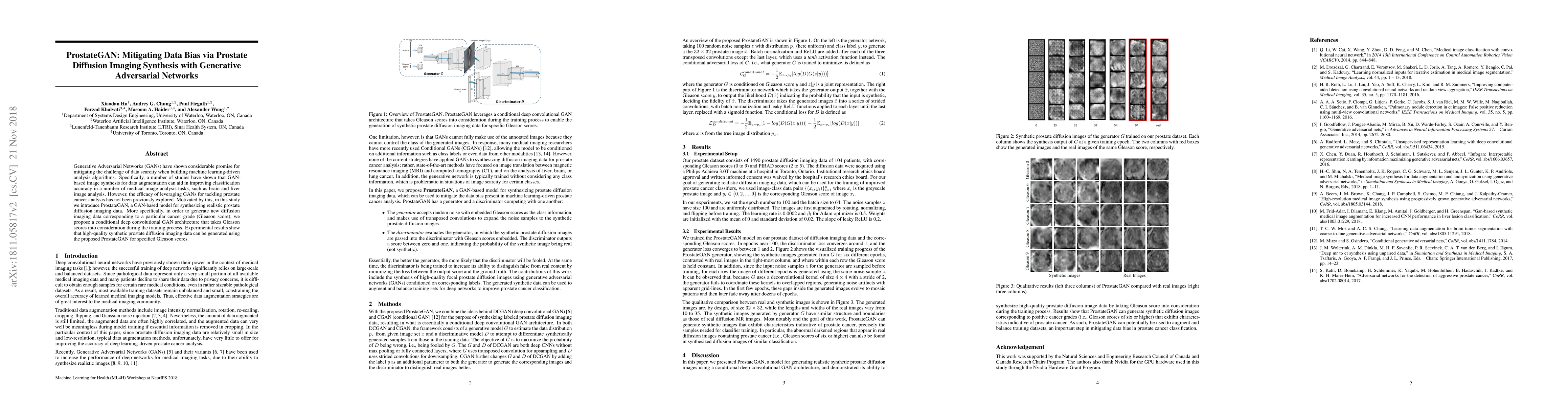 ProstateGAN introduces a conditional deep convolutional GAN to synthesize realistic prostate diffusion imaging data, addressing data scarcity and bias in prostate cancer analysis. Experimental results demonstrate the model's ability to generate high-quality synthetic images corresponding to specific Gleason scores.