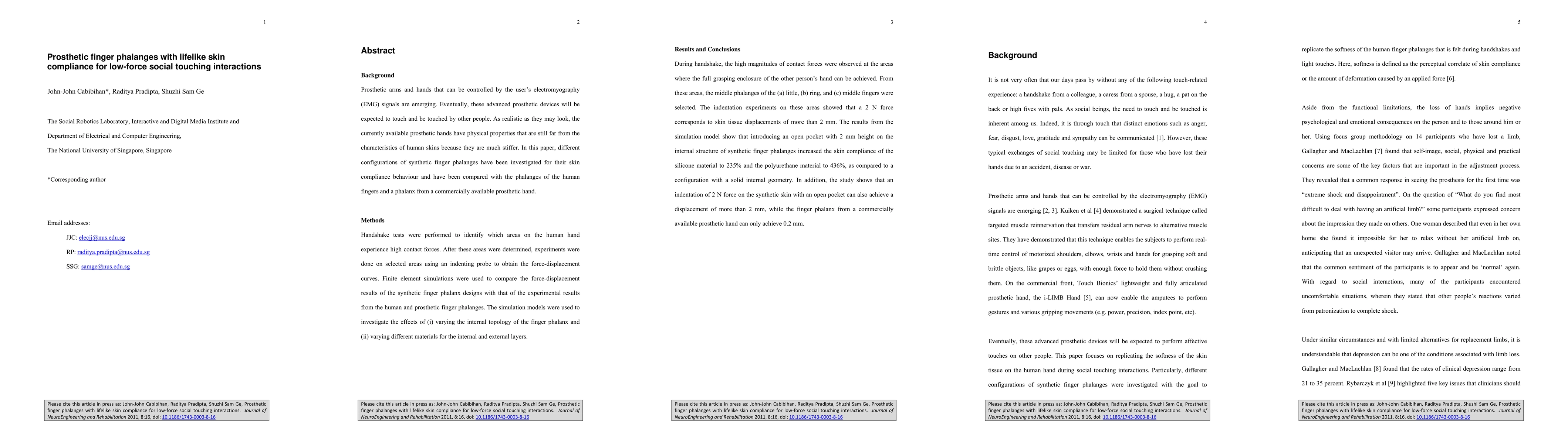 Prosthetic arms and hands that can be controlled by the user's electromyography (EMG) signals are emerging. Eventually, these advanced prosthetic devices will be expected to touch and be touched by other people. As realistic as they may look, the currently available prosthetic hands have physical properties that are still far from the characteristics of human skins because they are much stiffer. In this paper, different configurations of synthetic finger phalanges have been investigated for their skin compliance behaviour and have been compared with the phalanges of the human fingers and a phalanx from a commercially available prosthetic hand. Handshake tests were performed to identify which areas on the human hand experience high contact forces. After these areas were determined, experiments were done on selected areas using an indenting probe to obtain the force-displacement curves. Finite element simulations were used to compare the force-displacement results of the synthetic finger phalanx designs with that of the experimental results from the human and prosthetic finger phalanges. The simulation models were used to investigate the effects of (i) varying the internal topology of the finger phalanx and (ii) varying different materials for the internal and external layers.