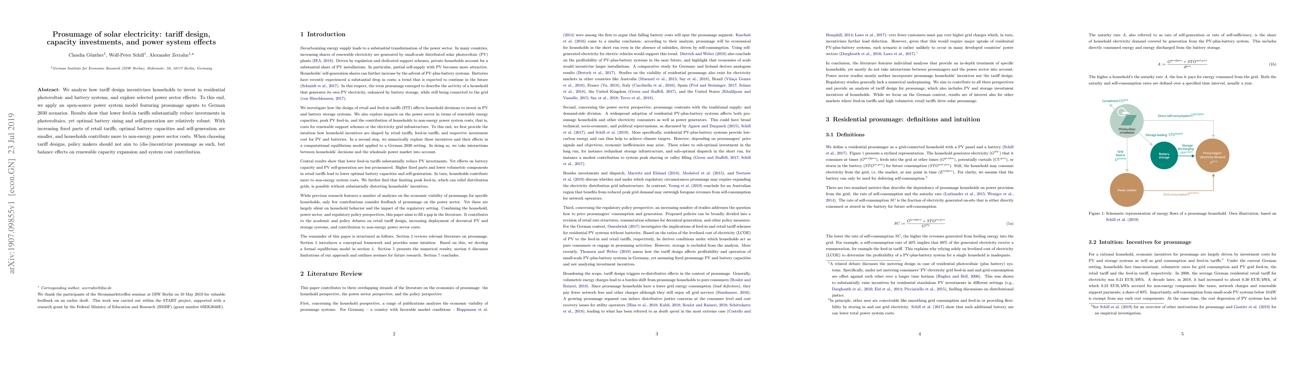 We analyze how tariff design incentivizes households to invest in residential photovoltaic and battery systems, and explore selected power sector effects. To this end, we apply an open-source power system model featuring prosumage agents to German 2030 scenarios. Results show that lower feed-in tariffs substantially reduce investments in photovoltaics, yet optimal battery sizing and self-generation are relatively robust. With increasing fixed parts of retail tariffs, optimal battery capacities and self-generation are smaller, and households contribute more to non-energy power sector costs. When choosing tariff designs, policy makers should not aim to (dis-)incentivize prosumage as such, but balance effects on renewable capacity expansion and system cost contribution.