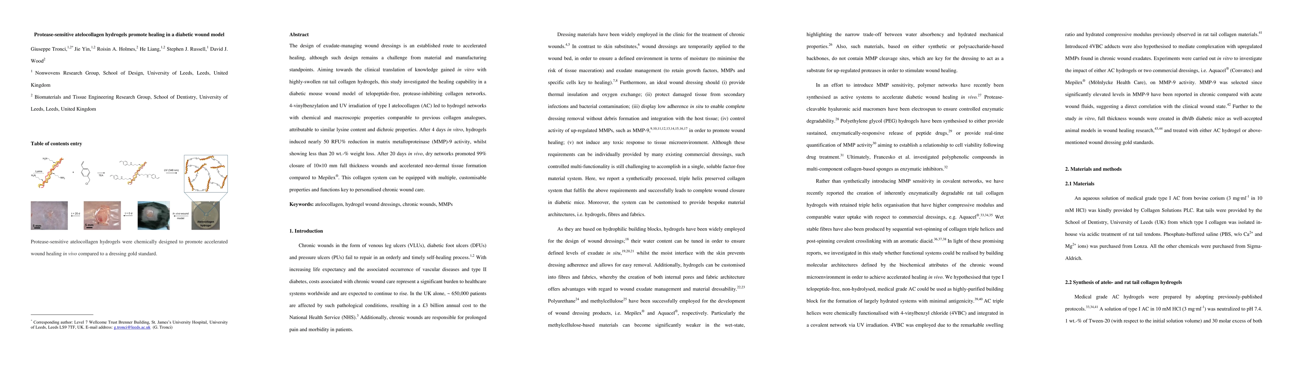 This study developed protease-sensitive atelocollagen hydrogels that significantly promoted healing in a diabetic mouse wound model, achieving 99% closure of full-thickness wounds and faster neodermal tissue formation compared to a standard dressing. The hydrogels demonstrated reduced MMP-9 activity and minimal weight loss, showing promise for personalized chronic wound care.