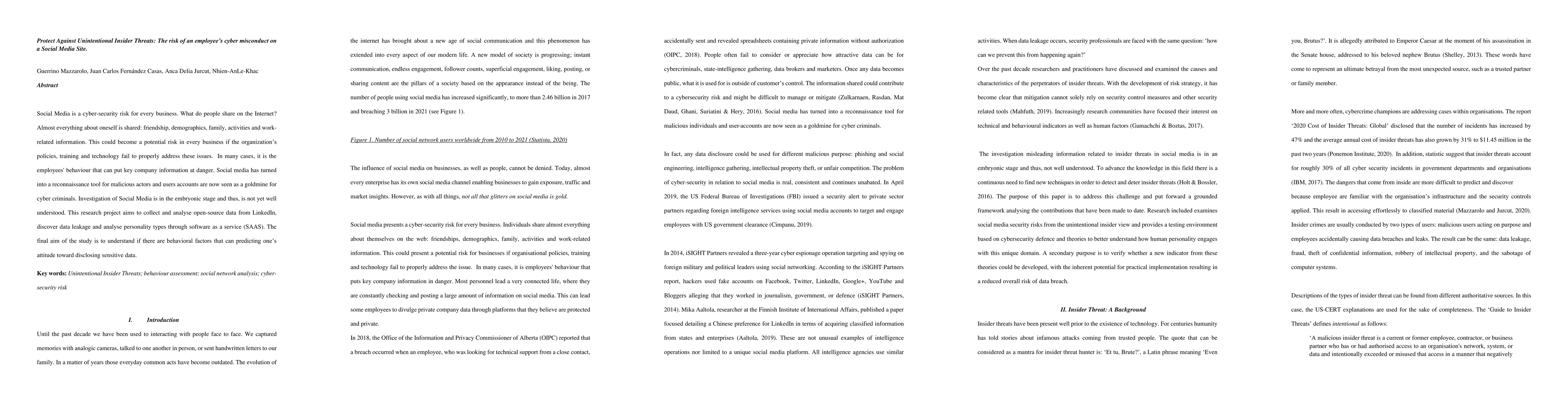 Social Media is a cyber-security risk for every business. What do people share on the Internet? Almost everything about oneself is shared: friendship, demographics, family, activities, and work-related information. This could become a potential risk in every business if the organization's policies, training and technology fail to properly address these issues. In many cases, it is the employees' behaviour that can put key company information at danger. Social media has turned into a reconnaissance tool for malicious actors and users accounts are now seen as a goldmine for cyber criminals. Investigation of Social Media is in the embryonic stage and thus, is not yet well understood. This research project aims to collect and analyse open-source data from LinkedIn, discover data leakage and analyse personality types through software as a service (SAAS). The final aim of the study is to understand if there are behavioral factors that can predicting one's attitude toward disclosing sensitive data.