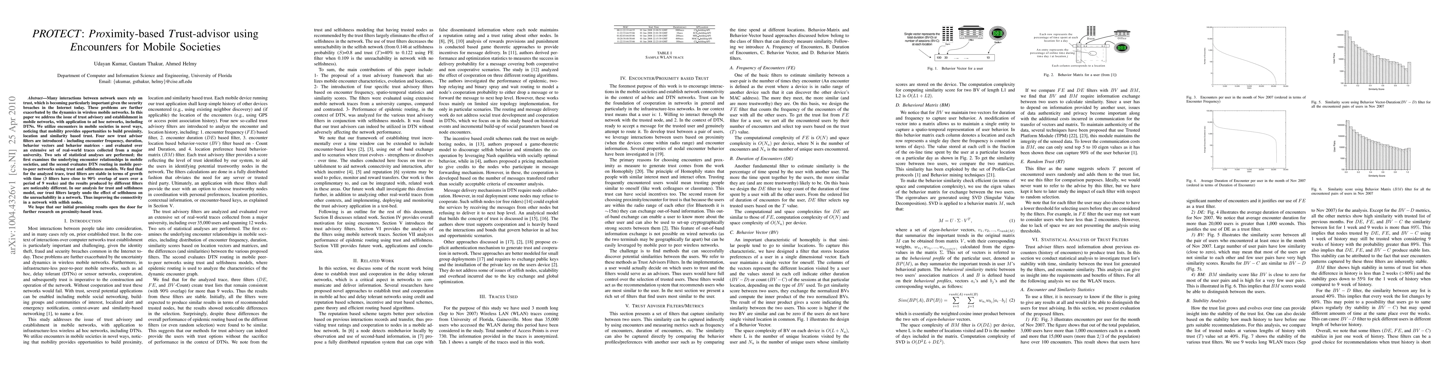 The paper proposes novel trust advisor filters utilizing encounters in mobile societies to build proximity, location, and similarity-based trust in mobile networks, including DTNs. It introduces four new trust filters: encounter frequency, duration, behavior vectors, and behavior matrices, and evaluates them using real-world traces from a major university.
