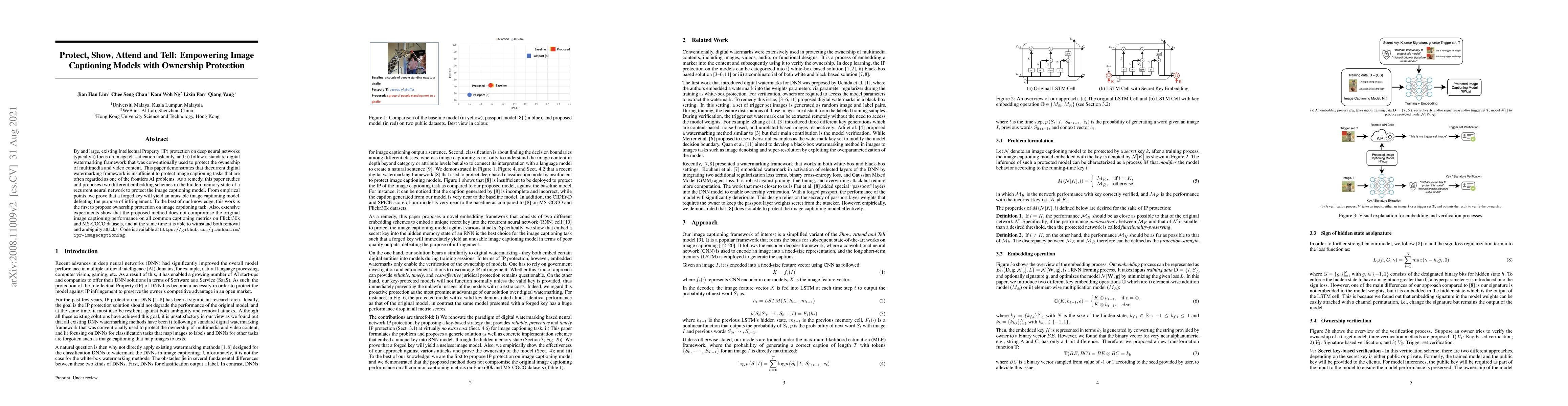 By and large, existing Intellectual Property (IP) protection on deep neural networks typically i) focus on image classification task only, and ii) follow a standard digital watermarking framework that was conventionally used to protect the ownership of multimedia and video content. This paper demonstrates that the current digital watermarking framework is insufficient to protect image captioning tasks that are often regarded as one of the frontiers AI problems. As a remedy, this paper studies and proposes two different embedding schemes in the hidden memory state of a recurrent neural network to protect the image captioning model. From empirical points, we prove that a forged key will yield an unusable image captioning model, defeating the purpose of infringement. To the best of our knowledge, this work is the first to propose ownership protection on image captioning task. Also, extensive experiments show that the proposed method does not compromise the original image captioning performance on all common captioning metrics on Flickr30k and MS-COCO datasets, and at the same time it is able to withstand both removal and ambiguity attacks. Code is available at https://github.com/jianhanlim/ipr-imagecaptioning
