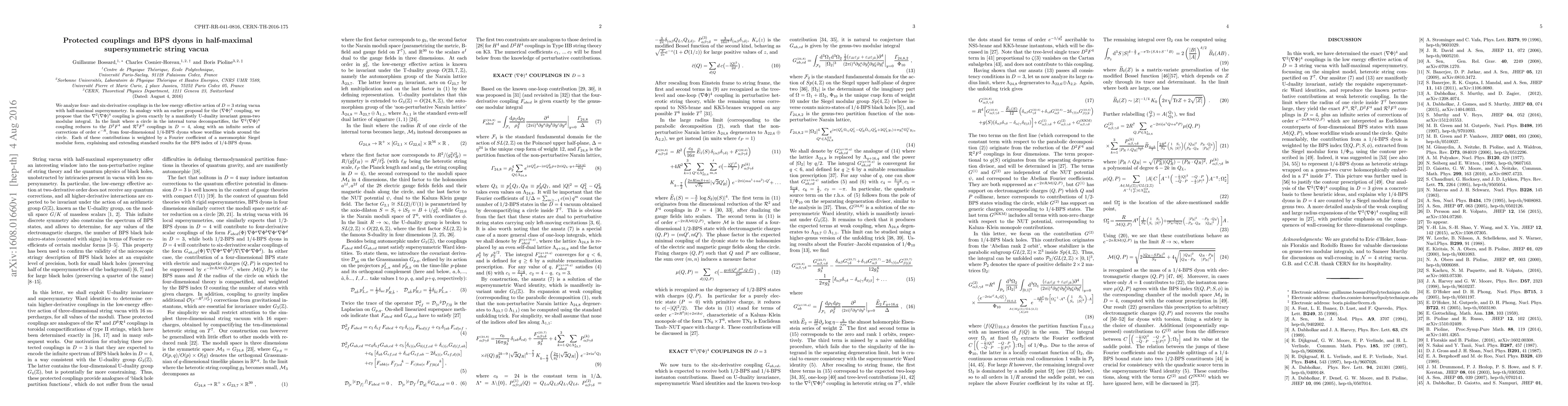 Researchers propose a new framework for analyzing couplings in string vacua with half-maximal supersymmetry, revealing connections to 1/4-BPS dyons in D=3 and D=4 theories.