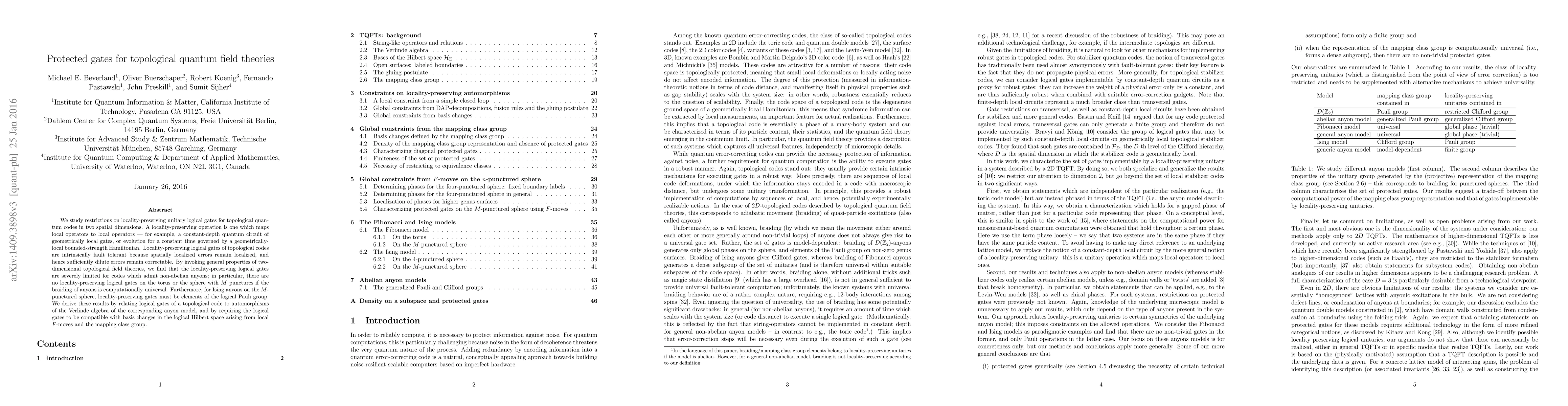 This paper investigates the constraints on locality-preserving unitary logical gates for topological quantum field theories in two dimensions, revealing that such gates are limited for codes with non-abelian anyons, especially when braiding is computationally universal. It concludes that for Ising anyons, locality-preserving gates must conform to the logical Pauli group.