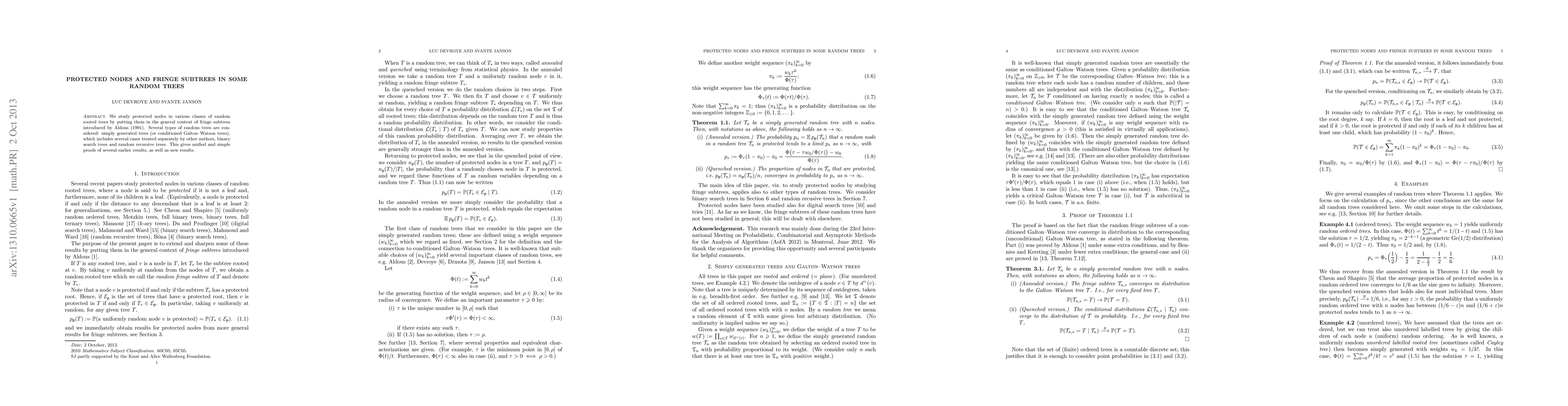 This paper investigates protected nodes within different classes of random rooted trees, relating them to Aldous's concept of fringe subtrees. It covers simply generated trees, binary search trees, and random recursive trees, providing unified proofs for existing results and uncovering new findings.