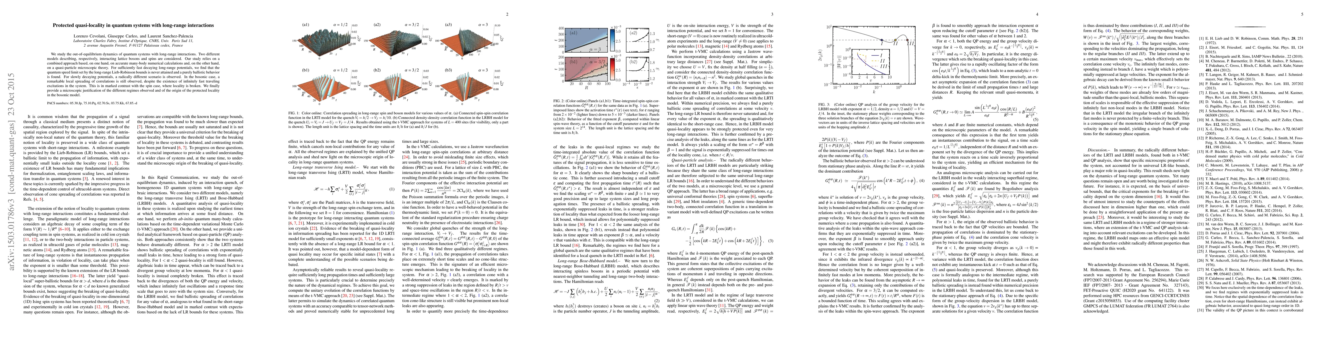 Quantum systems with long-range interactions exhibit different behavior depending on potential decay rate, with a ballistic regime observed for fast decaying potentials and non-local spreading in bosonic case.