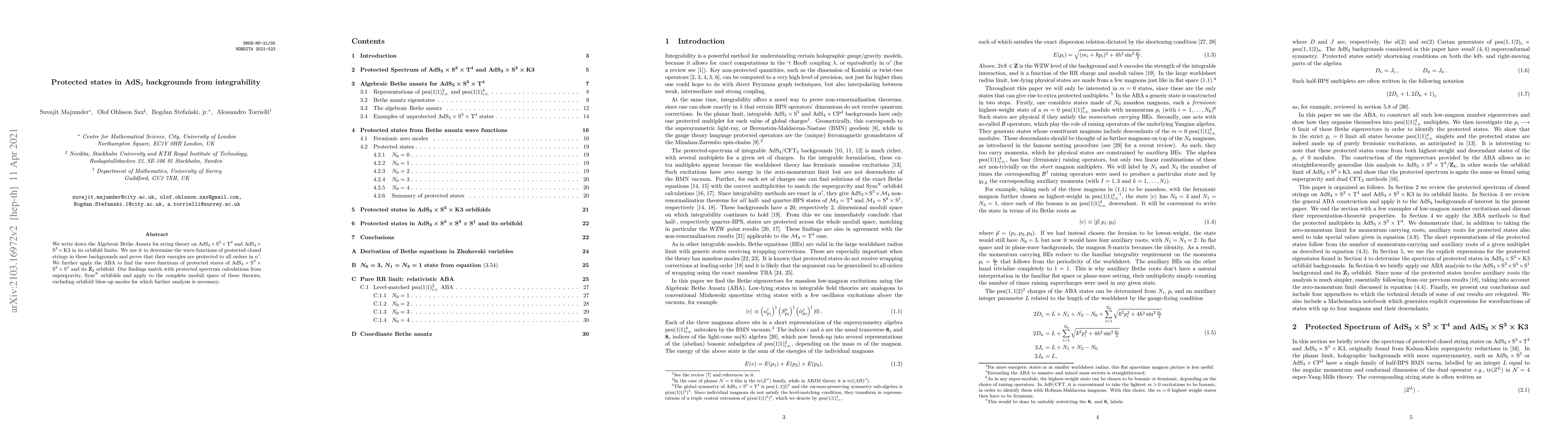 The paper presents a detailed construction of the Algebraic Bethe Ansatz for AdS3×S3×T4 and AdS3×S3×K3 backgrounds, providing explicit wave-functions for protected states and demonstrating their energy protection to all orders in α′.
