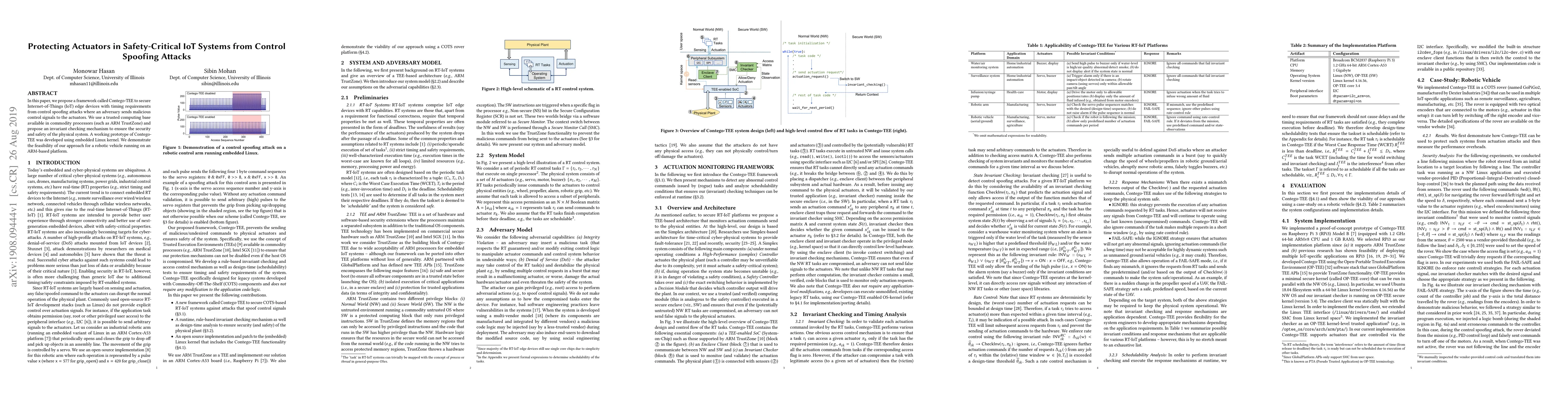 In this paper, we propose a framework called Contego-TEE to secure Internet-of-Things (IoT) edge devices with timing requirements from control spoofing attacks where an adversary sends malicious control signals to the actuators. We use a trusted computing base available in commodity processors (such as ARM TrustZone) and propose an invariant checking mechanism to ensure the security and safety of the physical system. A working prototype of Contego-TEE was developed using embedded Linux kernel. We demonstrate the feasibility of our approach for a robotic vehicle running on an ARM-based platform.
