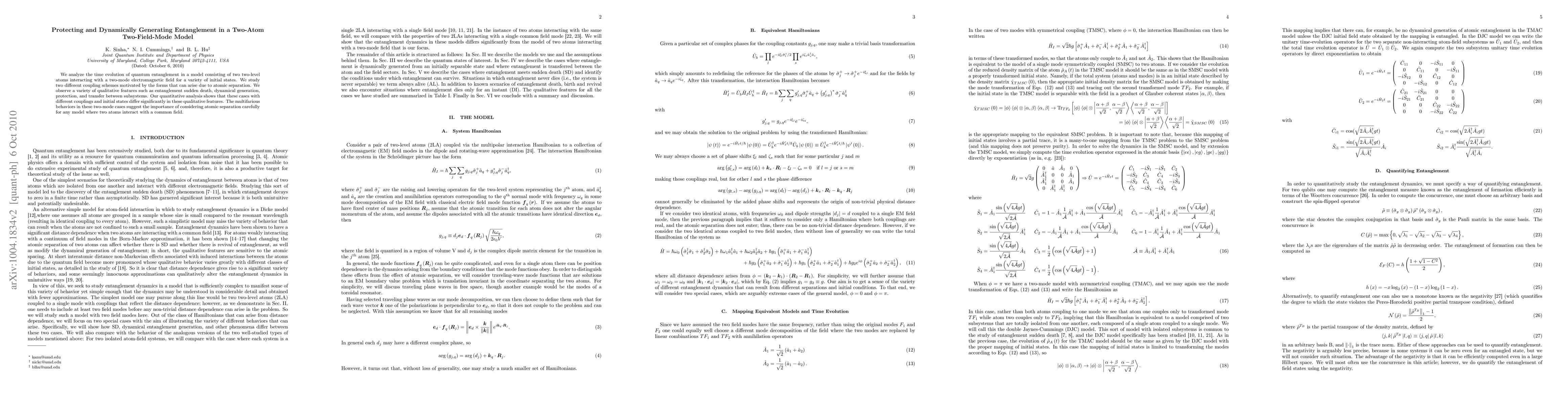We analyze the time evolution of quantum entanglement in a model consisting of two two-level atoms interacting with a two-mode electromagnetic field for a variety of initial states. We study two different coupling schemes motivated by the forms that can arise due to atomic separation. We observe a variety of qualitative features such as entanglement sudden death, dynamical generation, protection, and transfer between subsystems. Our quantitative analysis shows that these cases with different couplings and initial states differ significantly in these qualitative features. The multifarious behaviors in these two-mode cases suggest the importance of considering atomic separation carefully for any model where two atoms interact with a common field.