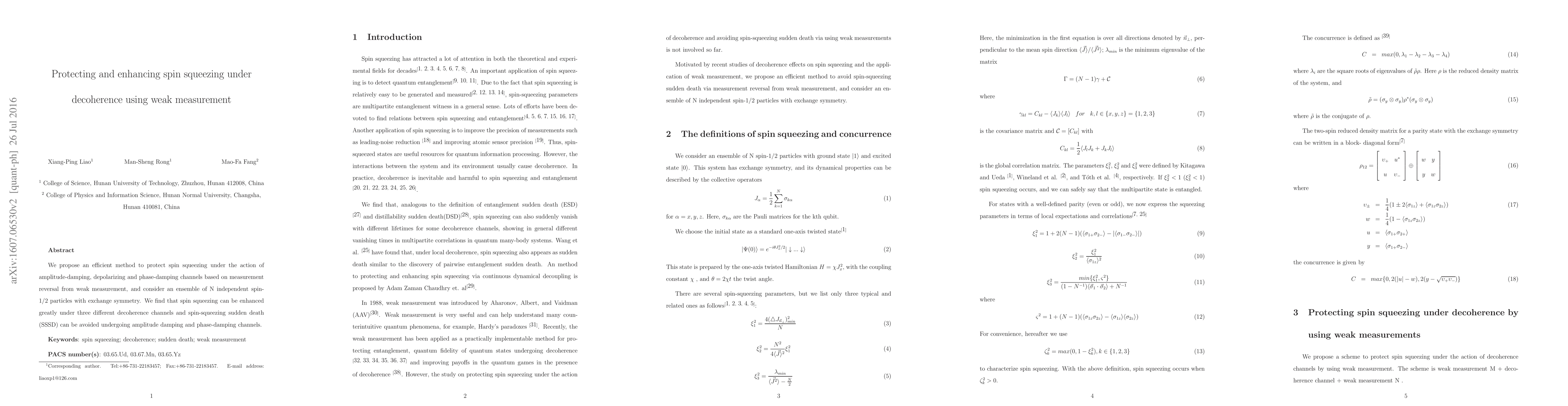 Summary: This paper proposes a method using weak measurement and measurement reversal to protect and enhance spin squeezing in an ensemble of N spin-1/2 particles against various decoherence channels, successfully avoiding spin-squeezing sudden death under amplitude and phase damping.