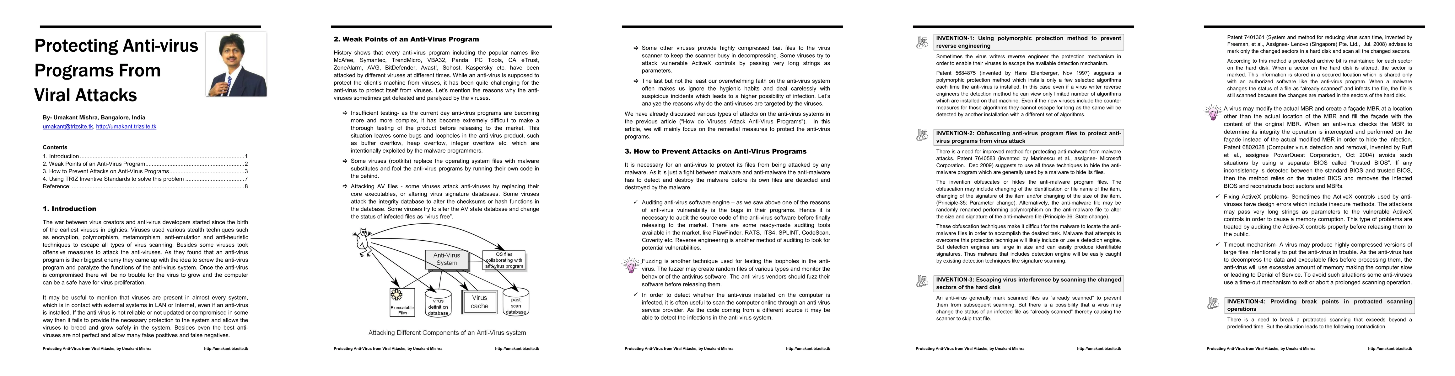 This paper explores strategies to protect anti-virus programs from viral attacks, emphasizing the need for proactive detection and destruction of malware before it can compromise the anti-virus itself. It discusses the use of TRIZ Inventive Standards to mitigate the harmful effects of viruses on anti-virus software.