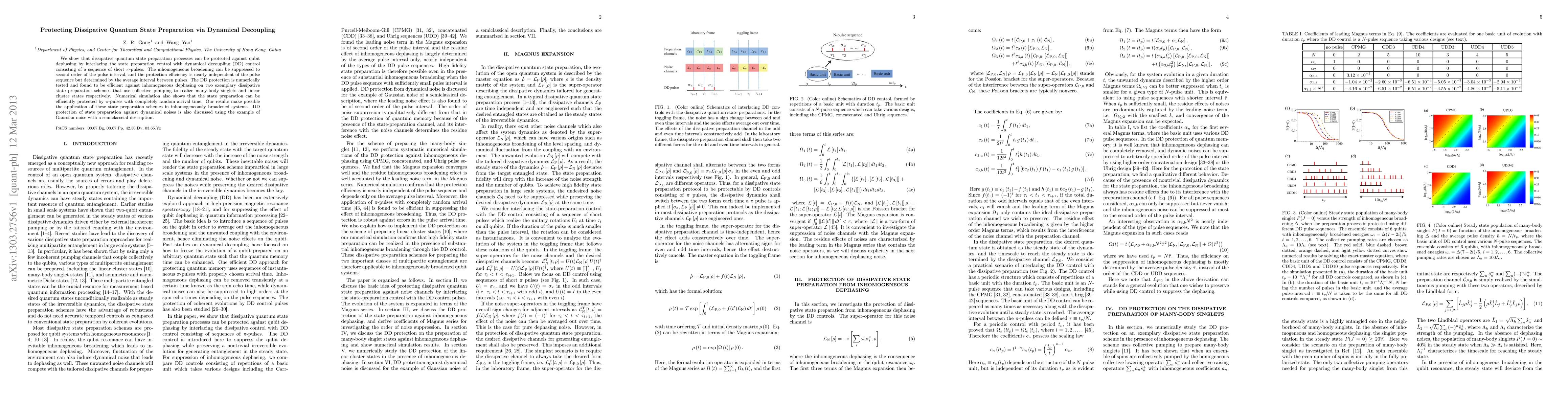 This paper demonstrates the protection of dissipative quantum state preparation against qubit dephasing through dynamical decoupling using a sequence of short $\pi$-pulses. The method effectively suppresses inhomogeneous broadening and maintains protection efficiency regardless of the pulse sequence, making it applicable to various state preparation schemes.