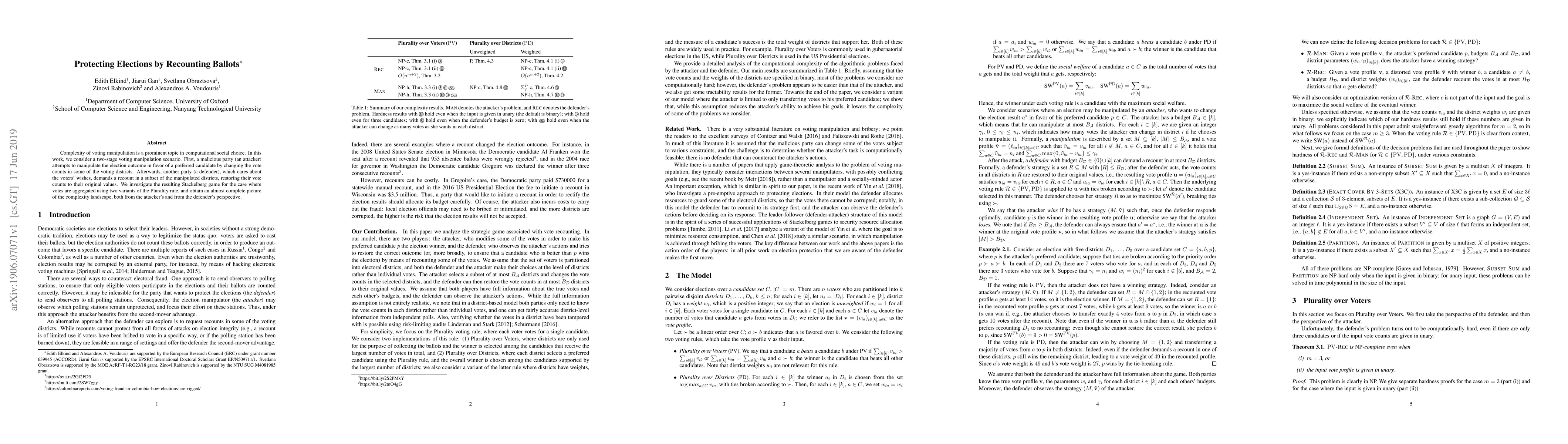 This paper explores how to protect elections from manipulation by analyzing a two-stage voting scenario where an attacker and a defender engage in a Stackelberg game. It provides an almost complete picture of the complexity landscape for different vote aggregation rules.