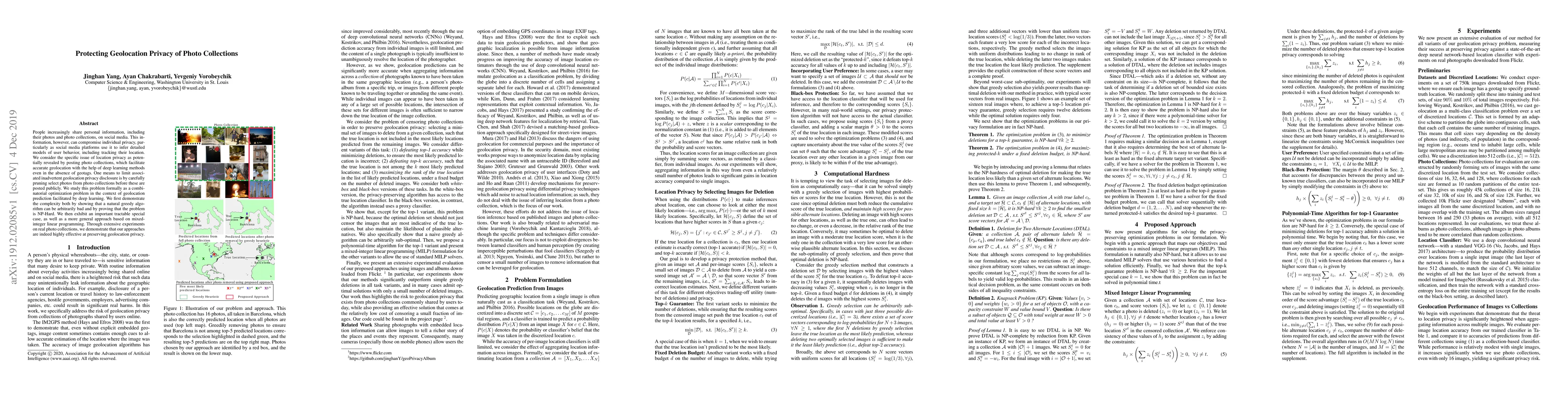 This paper addresses the challenge of protecting geolocation privacy in photo collections shared on social media, where deep learning can infer locations without geotags. It formulates the problem as a combinatorial optimization task, proving its complexity and proposing effective mixed-integer linear programming solutions to preserve privacy.
