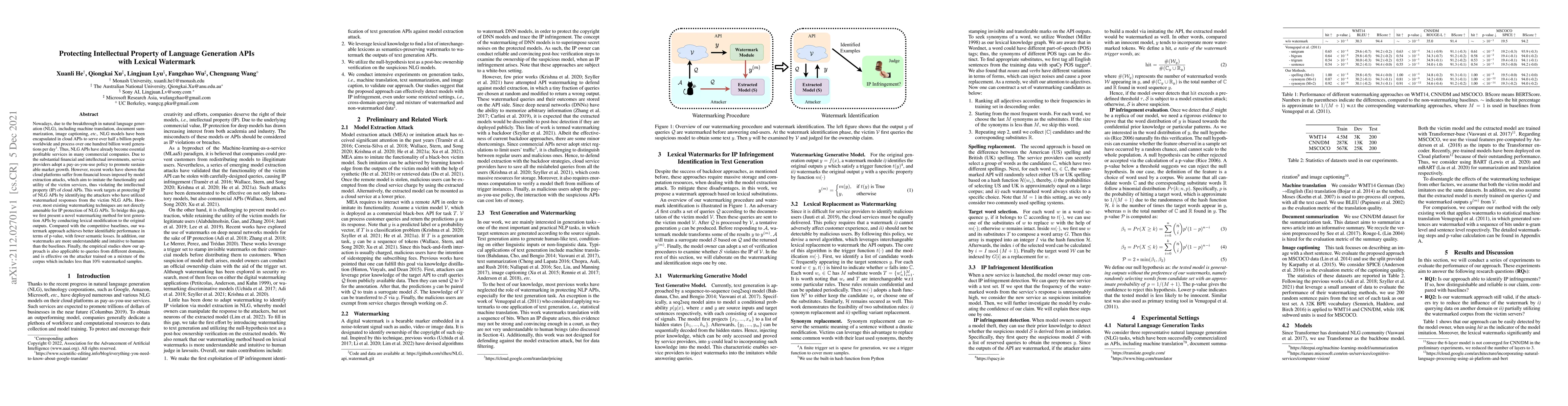This paper proposes a novel lexical watermarking method to protect the intellectual property of natural language generation (NLG) APIs, addressing the issue of model extraction attacks. The method modifies the original outputs to embed watermarks, achieving better identification performance with minimal semantic loss compared to existing techniques.