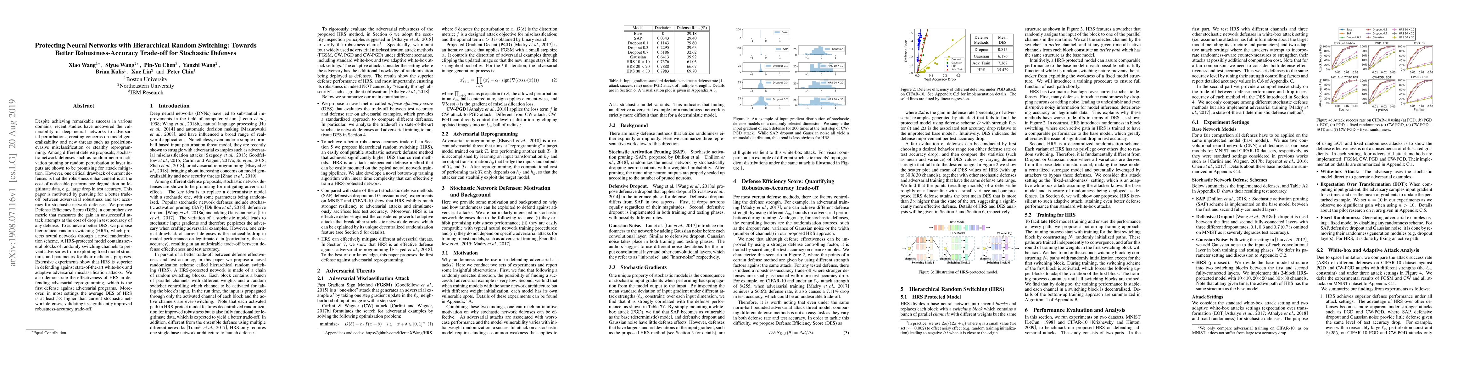 This paper proposes hierarchical random switching (HRS) to enhance the robustness-accuracy trade-off of stochastic defenses in neural networks. HRS employs random channel switching to thwart adversarial attacks while maintaining higher Defense Efficiency Scores compared to existing methods.