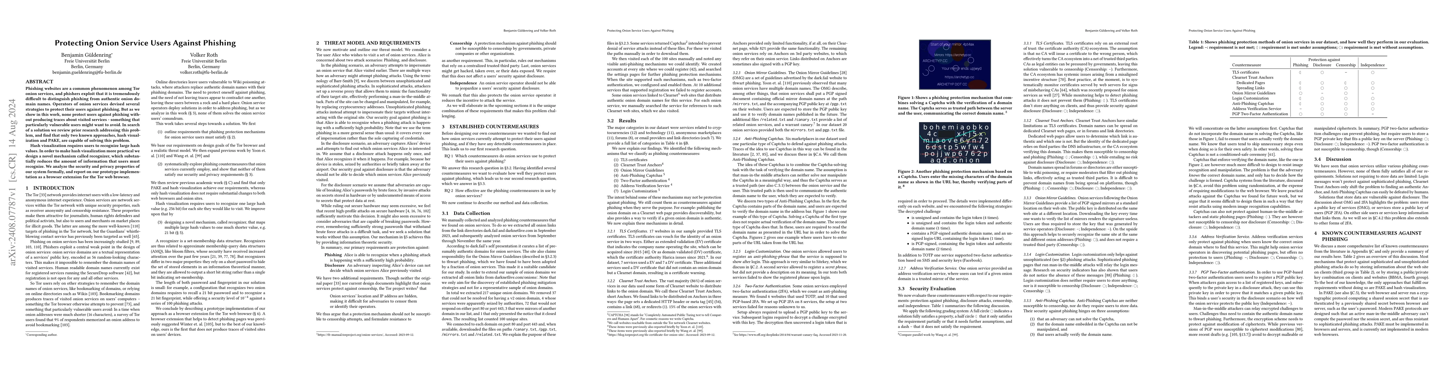 This research proposes new strategies to protect Tor onion service users from phishing attacks by reviewing existing solutions, highlighting the privacy issues of current methods, and introducing a novel hash visualization mechanism called recognizer to make large hash value recognition more practical. The study formally analyzes the security and privacy of this approach and presents a prototype browser extension.