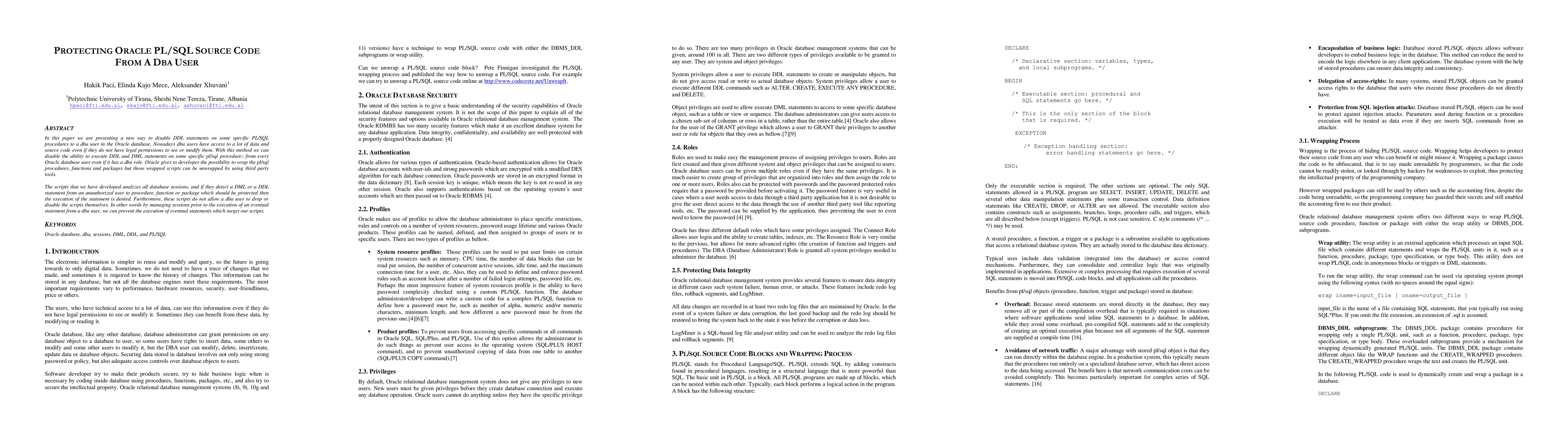 This paper introduces a method to prevent DBA users from executing DDL and DML statements on specific PL/SQL procedures in Oracle databases, even if they have DBA roles. The developed scripts monitor database sessions and block unauthorized access attempts, ensuring that the source code remains protected from being unwrapped or modified.