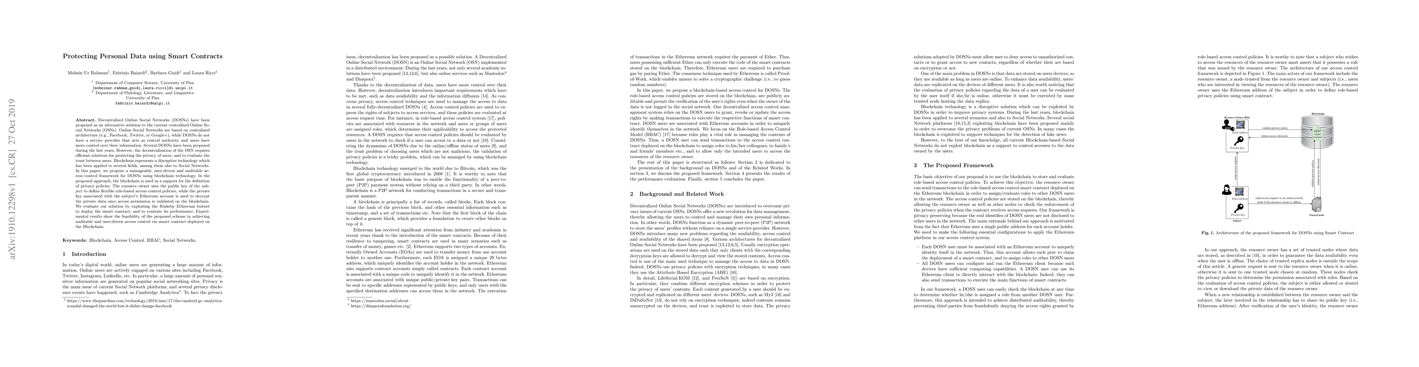 Decentralized Online Social Networks (DOSNs) have been proposed as an alternative solution to the current centralized Online Social Networks (OSNs). Online Social Networks are based on centralized architecture (e.g., Facebook, Twitter, or Google+), while DOSNs do not have a service provider that acts as central authority and users have more control over their information. Several DOSNs have been proposed during the last years. However, the decentralization of the OSN requires efficient solutions for protecting the privacy of users, and to evaluate the trust between users. Blockchain represents a disruptive technology which has been applied to several fields, among these also to Social Networks. In this paper, we propose a manageable, user-driven and auditable access control framework for DOSNs using blockchain technology. In the proposed approach, the blockchain is used as a support for the definition of privacy policies. The resource owner uses the public key of the subject to define flexible role-based access control policies, while the private key associated with the subject's Ethereum account is used to decrypt the private data once access permission is validated on the blockchain. We evaluate our solution by exploiting the Rinkeby Ethereum testnet to deploy the smart contract, and to evaluate its performance. Experimental results show the feasibility of the proposed scheme in achieving auditable and user-driven access control via smart contract deployed on the Blockchain.