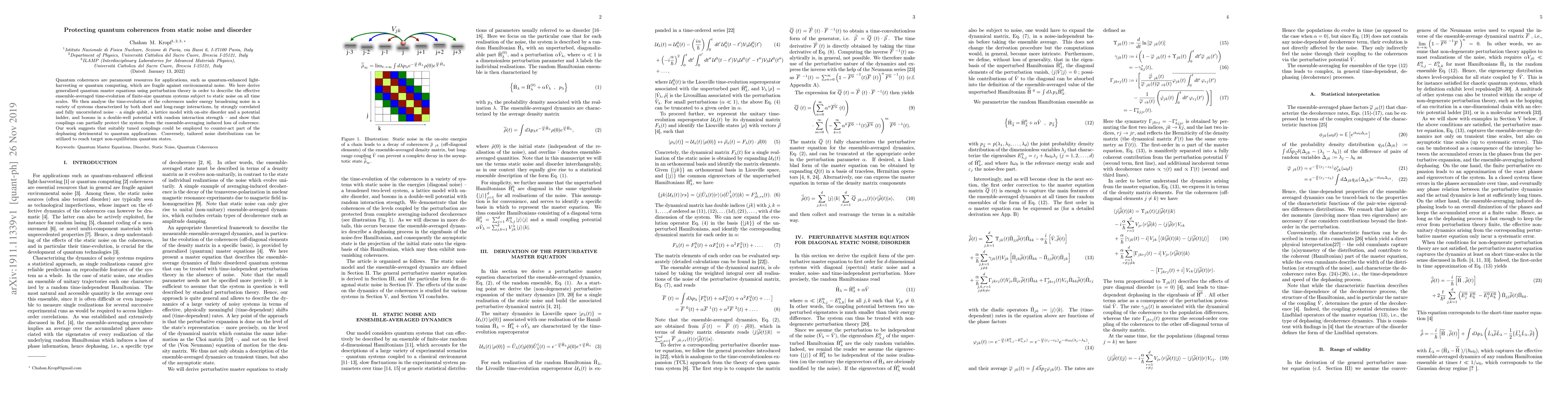 This research derives quantum master equations to analyze how couplings in quantum systems can protect coherences from static noise, applicable to quantum computing and light-harvesting. The study examines various systems, showing that tuned couplings can counteract dephasing, while tailored noise distributions can help achieve desired non-equilibrium quantum states.