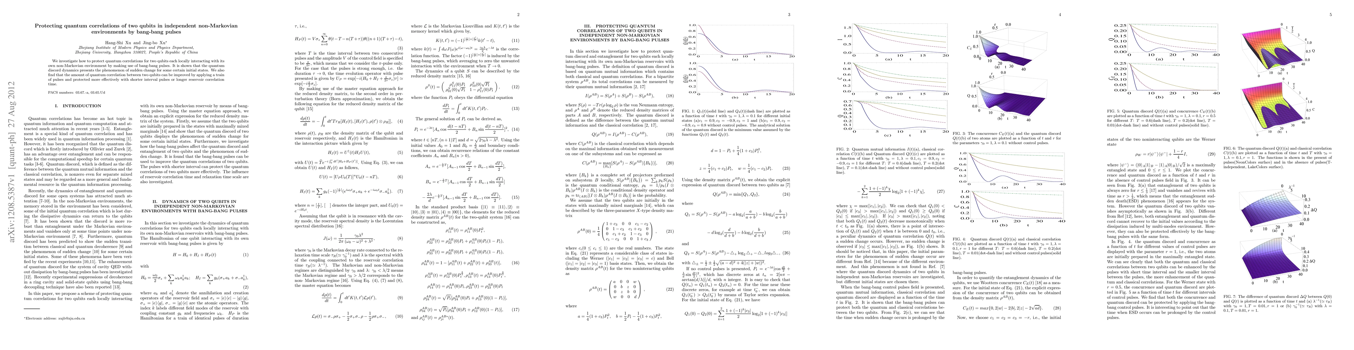 This paper explores the protection of quantum correlations in two qubits interacting with their own non-Markovian environments using bang-bang pulses. It demonstrates that quantum discord can undergo sudden changes and that applying a series of pulses with shorter intervals or longer reservoir correlation times can enhance and protect quantum correlations.