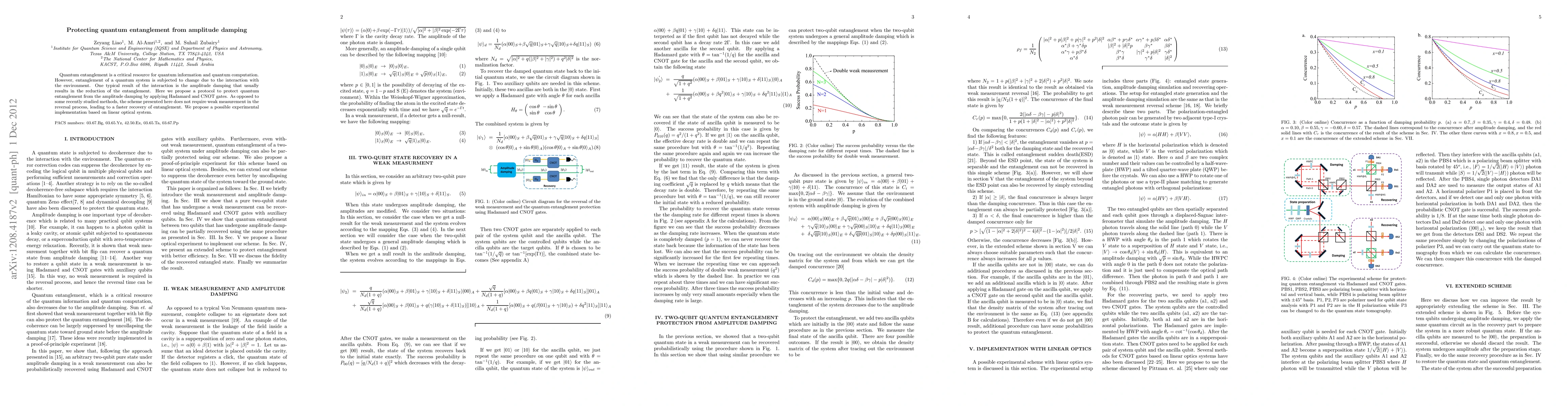 This paper proposes a protocol using Hadamard and CNOT gates to protect quantum entanglement from amplitude damping without requiring weak measurement, thus enabling faster recovery. An experimental implementation based on a linear optical system is suggested.