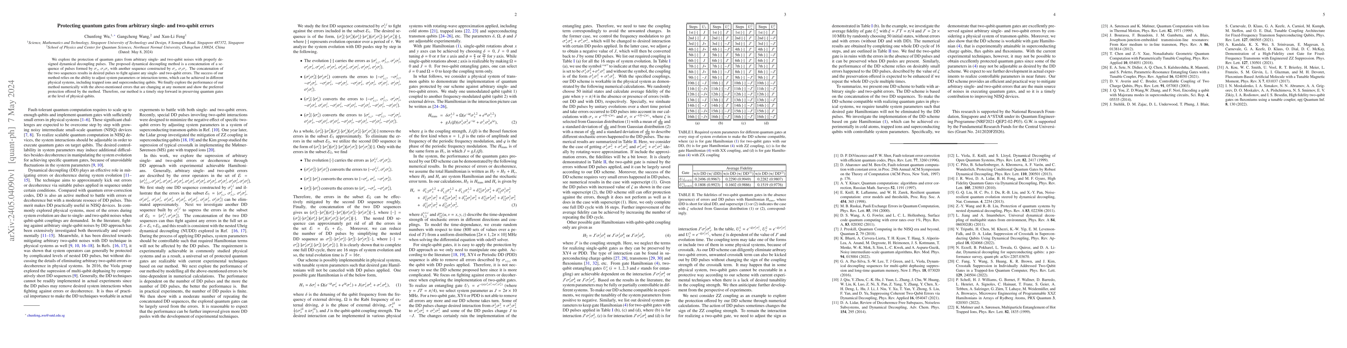This research proposes a method using dynamical decoupling pulses, combining $\sigma_x$ and $\sigma_z$ sequences, to protect quantum gates from arbitrary single- and two-qubit errors. The approach demonstrates effective error suppression through numerical simulations, marking progress in maintaining quantum gate integrity.