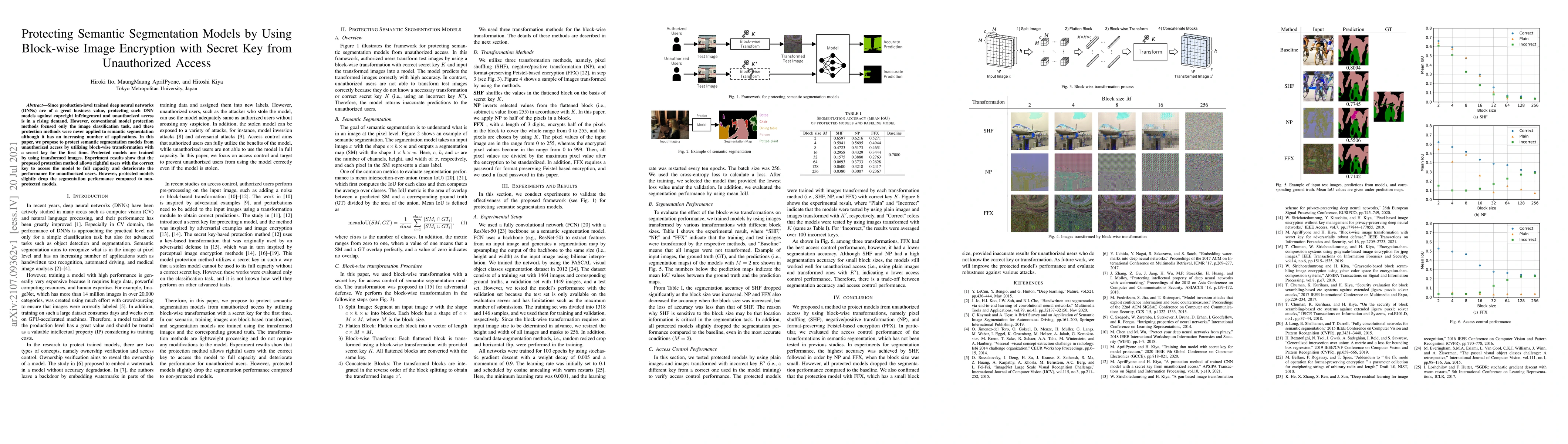 This paper proposes a novel method to protect semantic segmentation models from unauthorized access by employing block-wise image encryption with a secret key. The method allows authorized users with the correct key to access the model fully, while degrading performance for unauthorized users, though it slightly reduces segmentation accuracy.