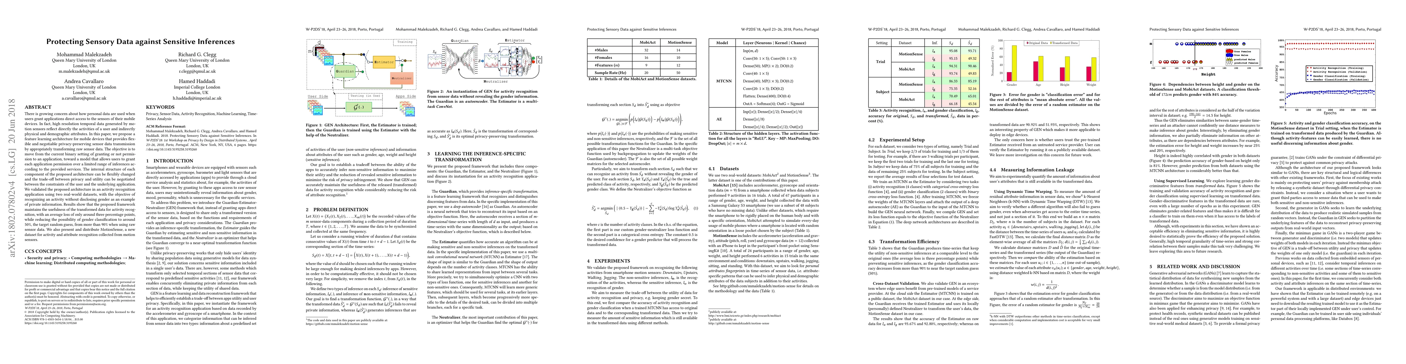 This paper proposes a feature learning architecture for mobile devices to protect sensory data from sensitive inferences by transforming raw sensor data. The architecture allows users to negotiate permissions for applications, balancing privacy and utility, validated through an activity recognition application that maintains data usefulness while reducing gender classification accuracy.