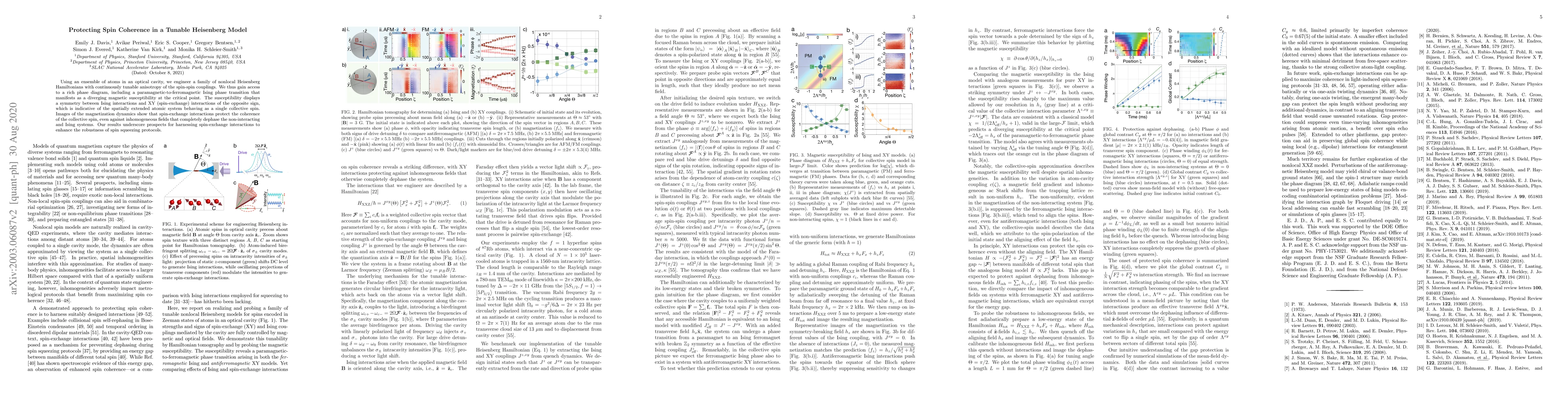 This paper investigates a tunable Heisenberg model using atoms in an optical cavity, revealing a phase transition and demonstrating that spin-exchange interactions protect spin coherence against dephasing fields, enhancing the robustness of spin squeezing protocols.