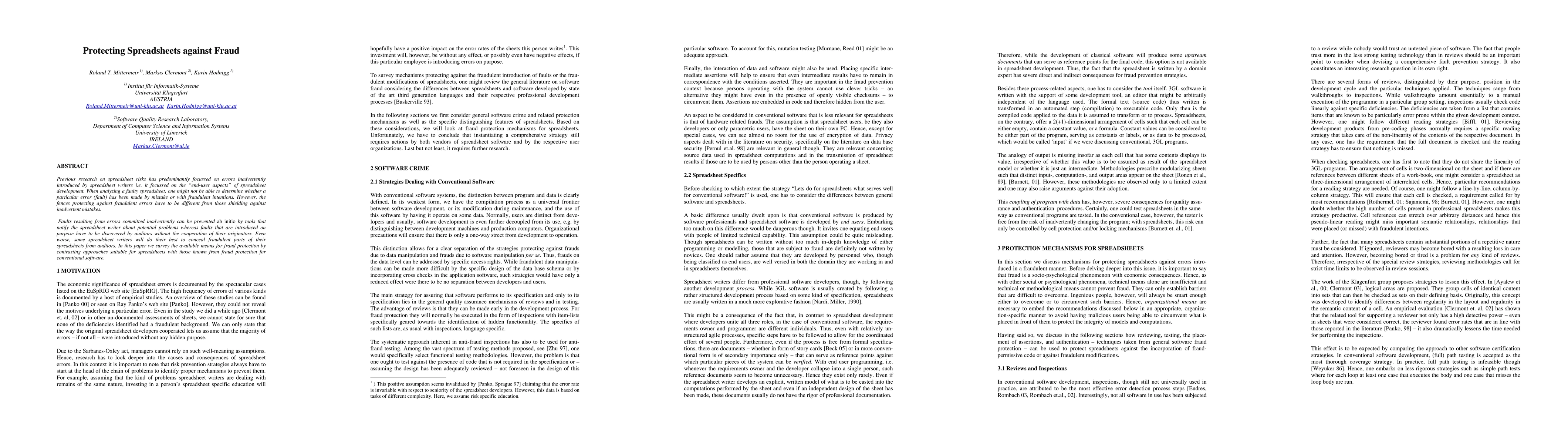 Research explores how to protect spreadsheets from fraudulent errors, highlighting the need for different security measures than those used for conventional software, and surveying available means for fraud protection in spreadsheets.