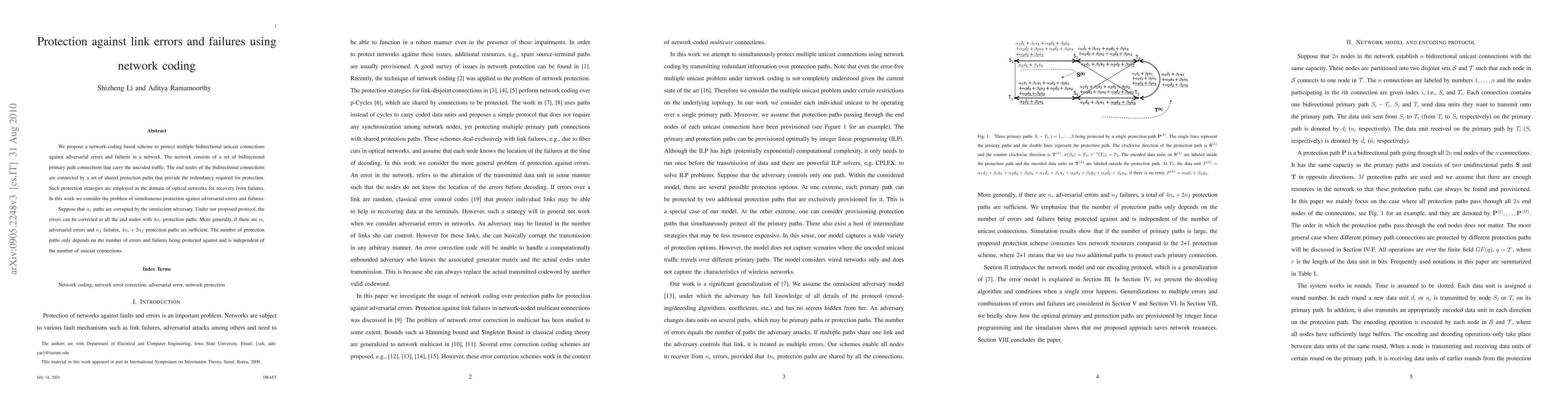 This paper proposes a network-coding scheme to protect multiple bidirectional unicast connections against adversarial errors and failures. The scheme uses a set of shared protection paths to ensure that up to 4 times the number of corrupted paths can be corrected, with additional paths for failures.