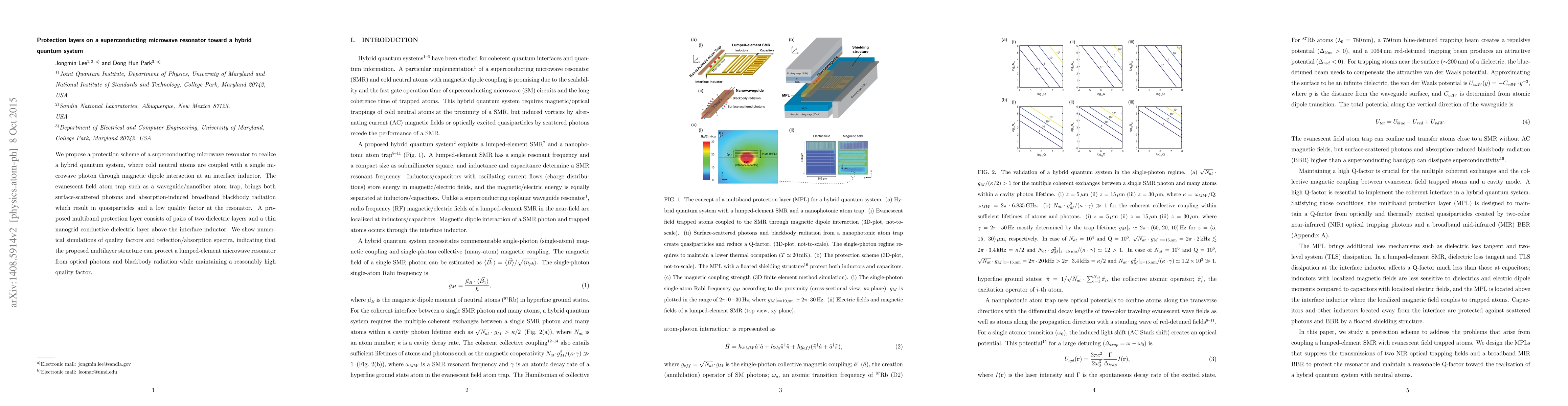 We propose a protection scheme of a superconducting microwave resonator to realize a hybrid quantum system, where cold neutral atoms are coupled with a single microwave photon through magnetic dipole interaction at an interface inductor. The evanescent field atom trap such as a waveguide/nanofiber atom trap, brings both surface-scattered photons and absorption-induced broadband blackbody radiation which result in quasiparticles and a low quality factor at the resonator. A proposed multiband protection layer consists of pairs of two dielectric layers and a thin nanogrid conductive dielectric layer above the interface inductor. We show numerical simulations of quality factors and reflection/absorption spectra, indicating that the proposed multilayer structure can protect a lumped-element microwave resonator from optical photons and blackbody radiation while maintaining a reasonably high quality factor.